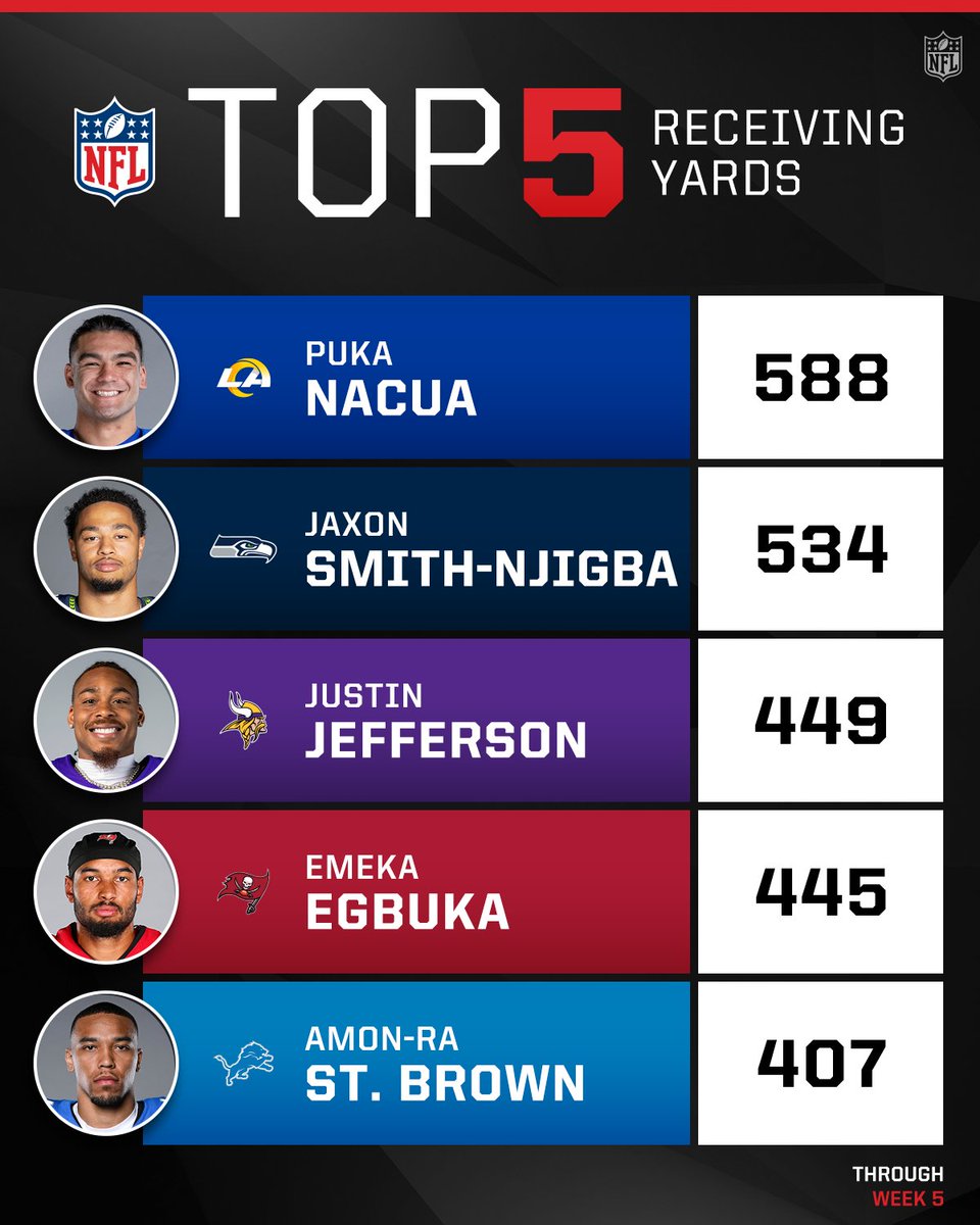 NFL官方X账号发推特报道,国联球队近五周接球码数横扫全场