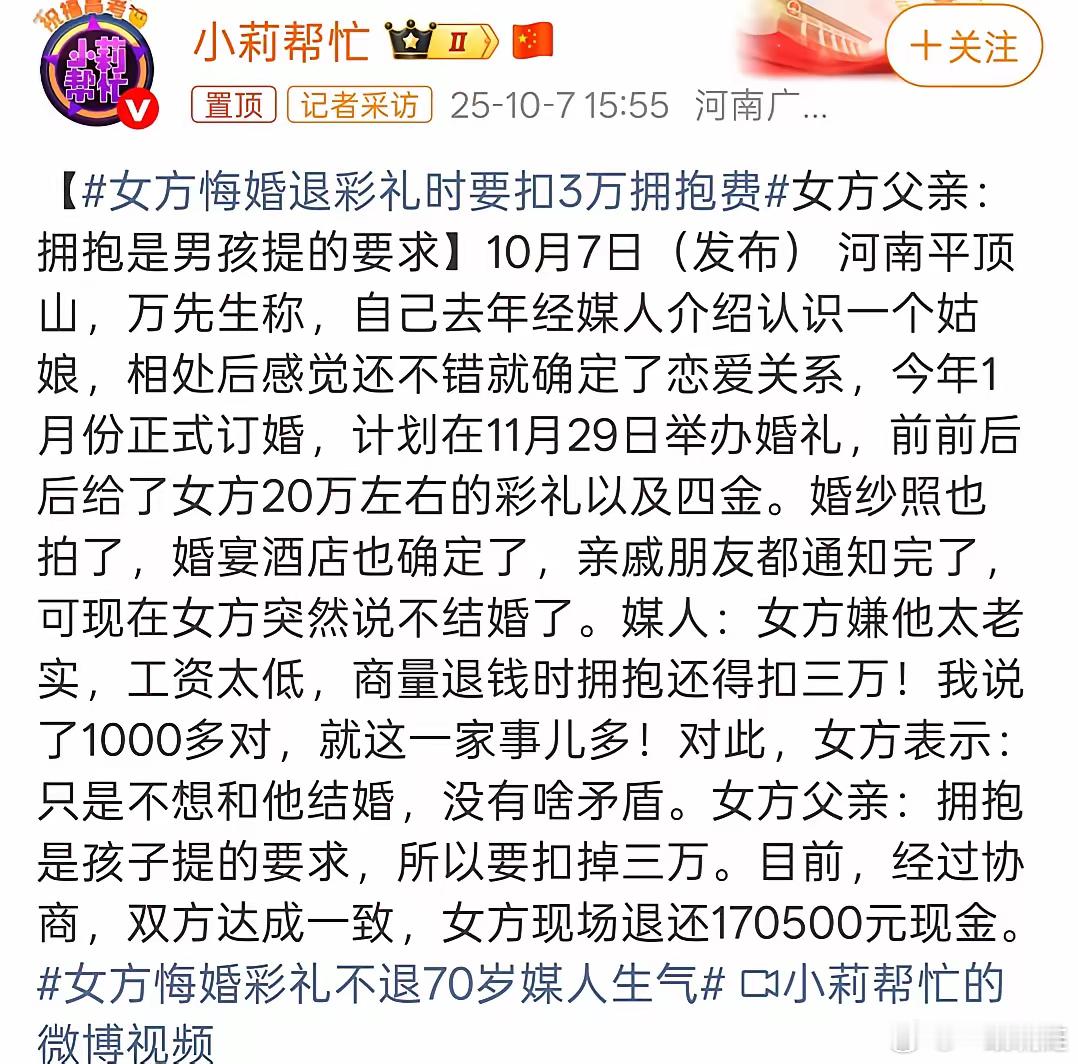 真是一次次被小仙女刷新下限!近日,河南平顶山,结婚前女方嫌男方人老实工资低要悔婚,但退彩礼时要求扣3万拥抱费,20万只能退17万!