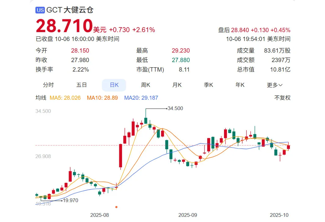 10月6日,大健云仓收盘,录得小幅增长,市值站稳10亿美元,过去5个月其估值翻倍。