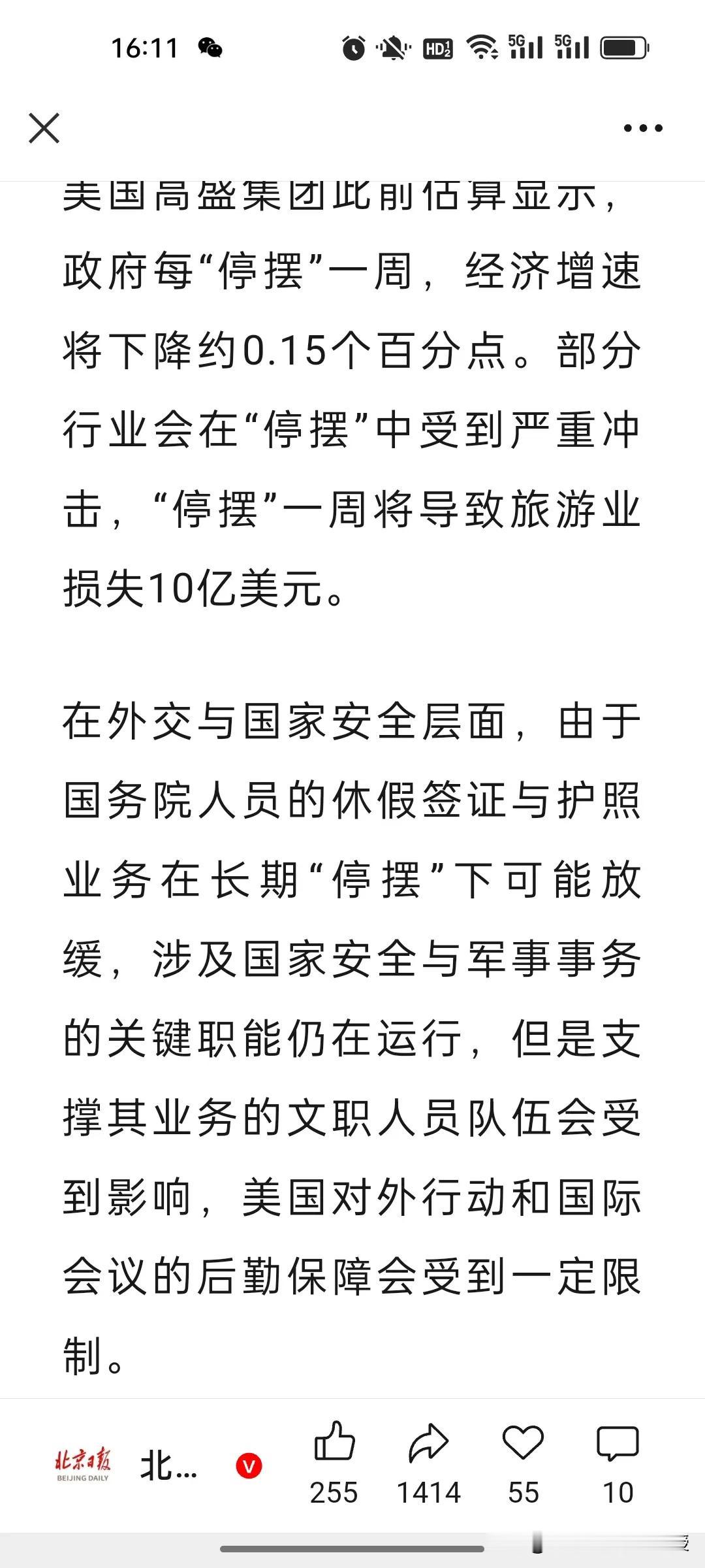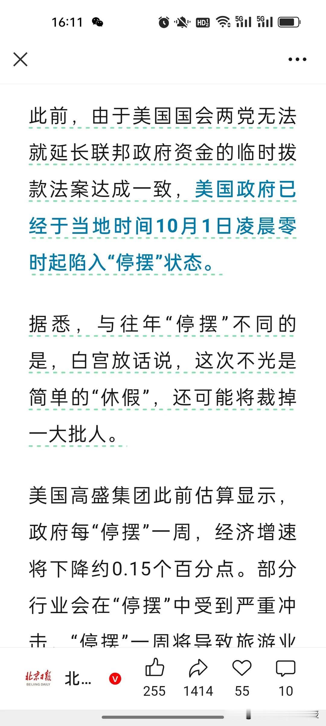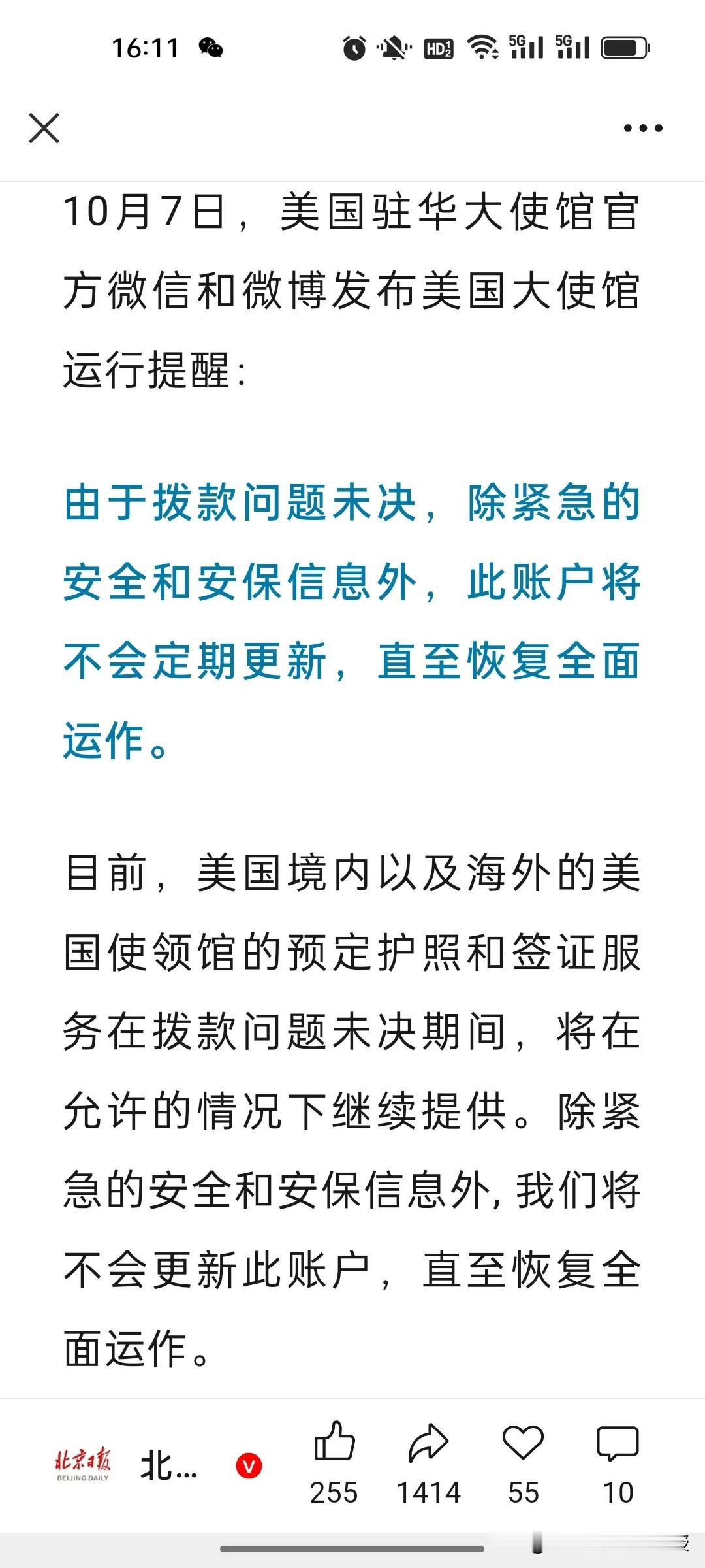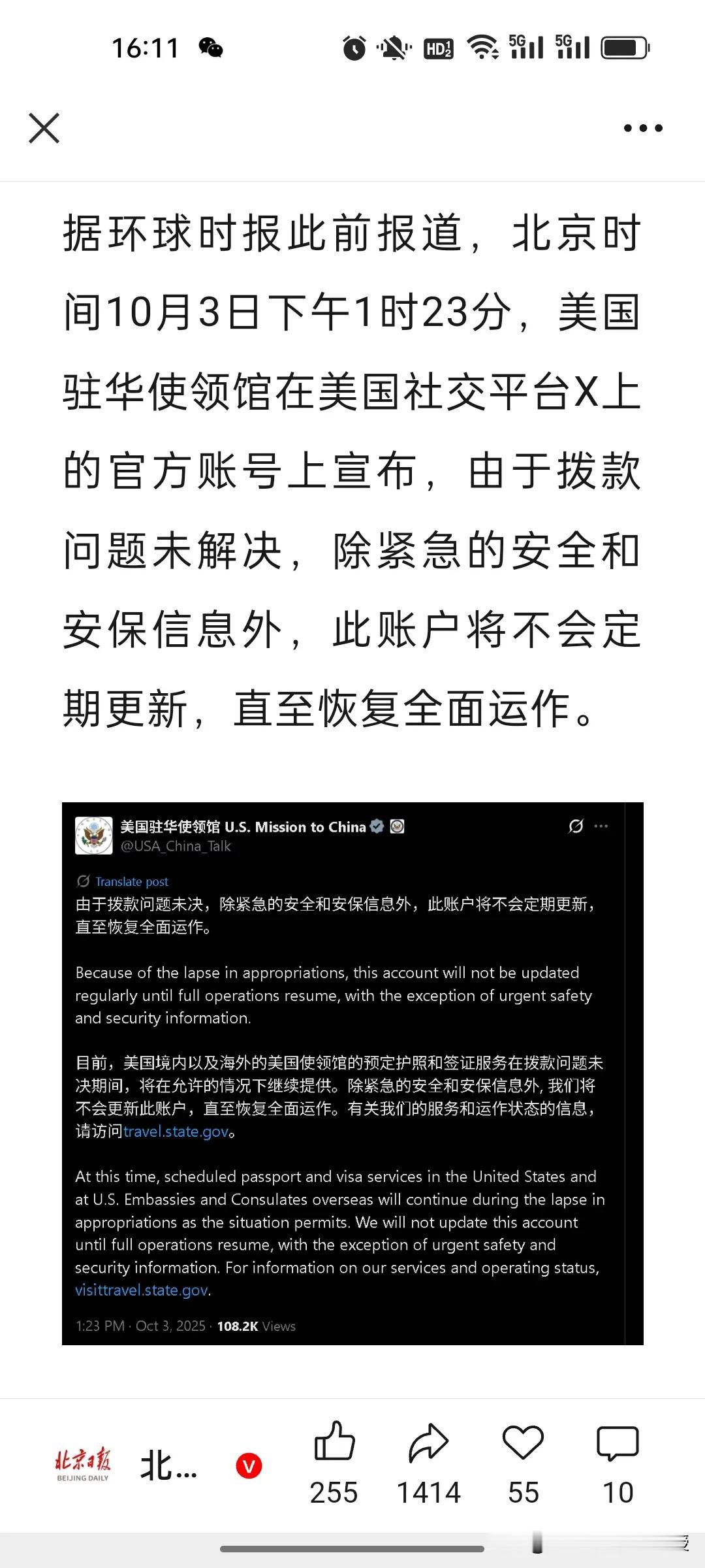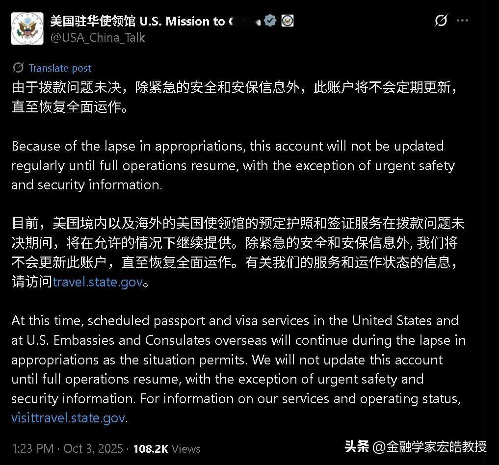不愿意义务干活!美国驻华大使馆微博和微信刚刚都发通知,说自己不会定期更新了,因为政府拨款问题没解决,他们就停更了。美国驻华大使馆也不会义务干活,无经费便无服务。不过,签证和护照服务还在继续。说明美国在压缩开支时仍试图维持外交基本功能,避免引发更大范围的动荡。 这次美国政府停摆可能要裁员一批人来缩减开支,裁员虽能短期奏效,但代价沉重,更深层次地暴露了美国政治已从政策意见分歧演变为制度性抗衡,但这样失去的是美国政府治理的稳定性和公信力。美国驻华大使馆都发文不干了,美国驻他国大使馆和机构呢?特朗普天天嚷着要拿诺贝尔和平奖,标榜治理世界秩序有功,可是,自己国家内部都无法实现和平。