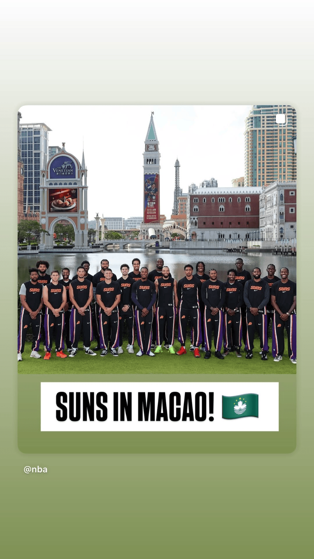 虎扑10月08日讯太阳后卫科林-吉莱斯皮更新社交媒体,转发NBA官方晒出的太阳全队在澳门威尼斯人前的大合影。