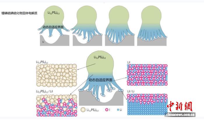 为解决这一难题,研究团队开发出一种在硫化物电解质中引入碘离子的新技术:电池工作时,这些碘离子会在电场作用下移动至电极界面,形成一层富碘界面。这层界面能够主动吸引锂离子,像“自我修复”一样自动填充进所有的缝隙和孔洞,从而让电极和电解质始终保持紧密贴合。