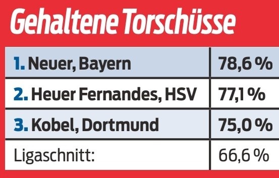 直播吧10月8日讯《体育图片报》统计了本赛季门将在德甲联赛中的扑救成功率,并列出前三名榜单,拜仁39岁门将诺伊尔以78.6%居首。
