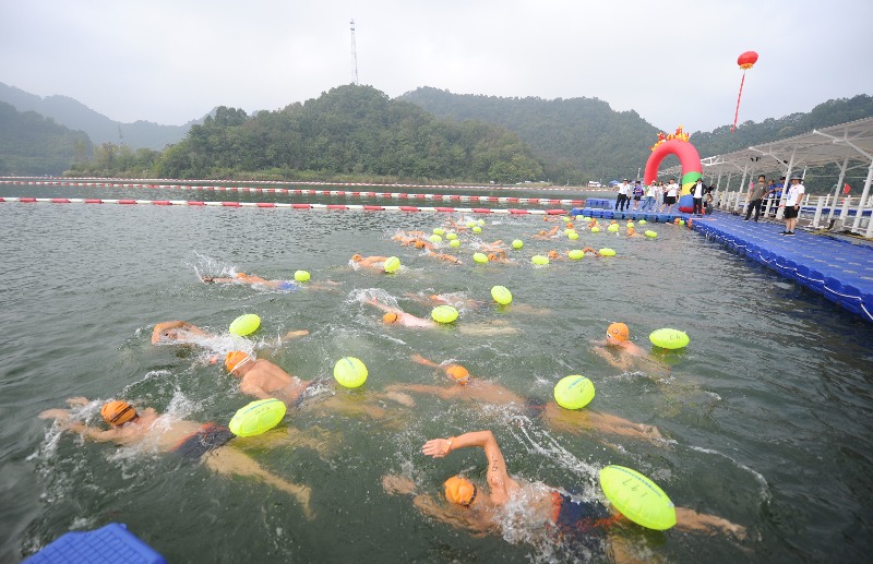 随着发令汽笛声响,选手们如离弦之箭跃入水中,平静的湖面瞬间激起层层浪花。他们挥臂斩浪、奋“泳”前行,身姿在湖光山色间划出优美弧线,岸边观众的喝彩声、加油声此起彼伏,与水波声交织成热烈的赛事交响。