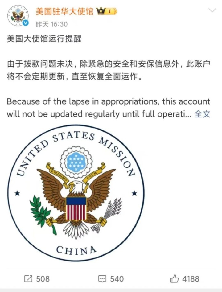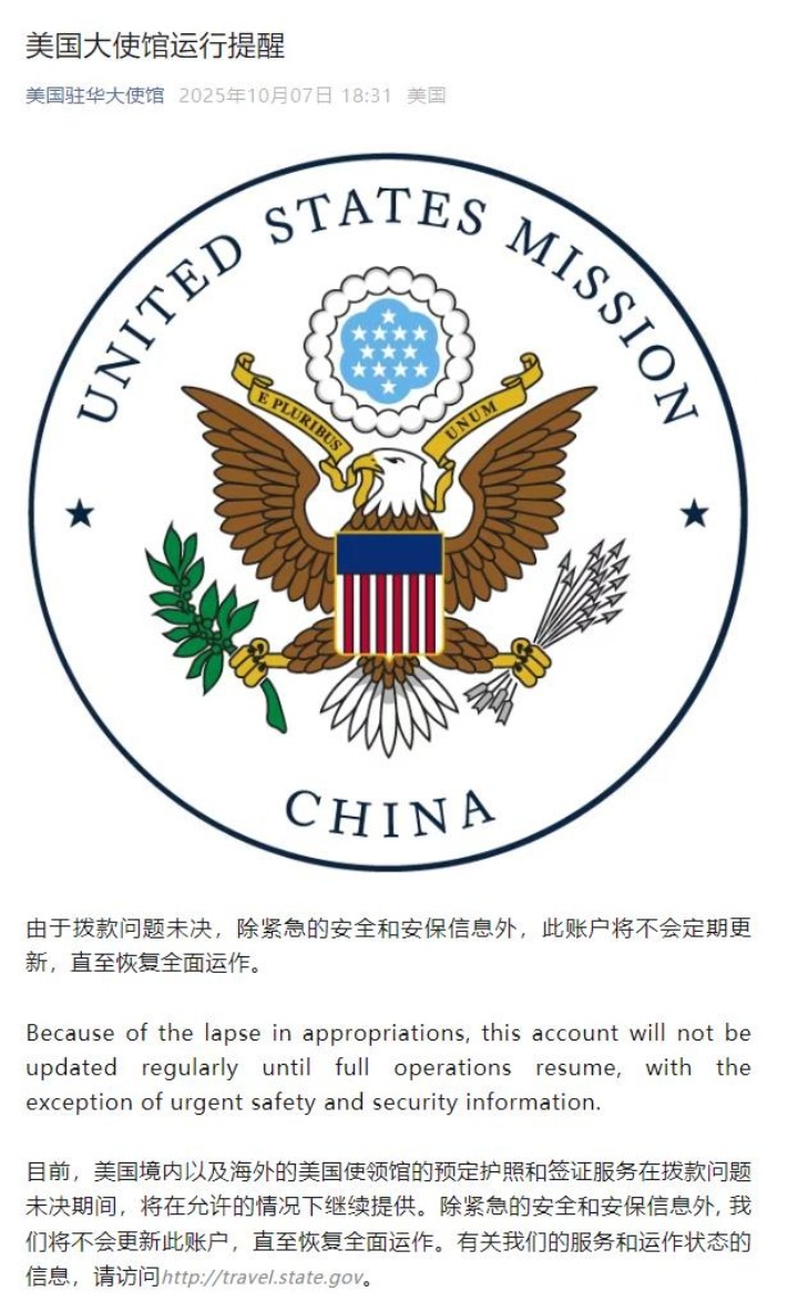 10月7日,美国驻华大使馆官方微信发布“运行提醒”称:由于拨款问题未决,除紧急的安全和安保信息外,该账户将不会定期更新,直至恢复全面运作。目前,美国境内以及海外的美国使领馆的预定护照和签证服务在拨款问题未决期间,将在允许的情况下继续提供。除紧急的安全和安保信息外,美国驻华大使馆将不会更新该账户,直至恢复全面运作。