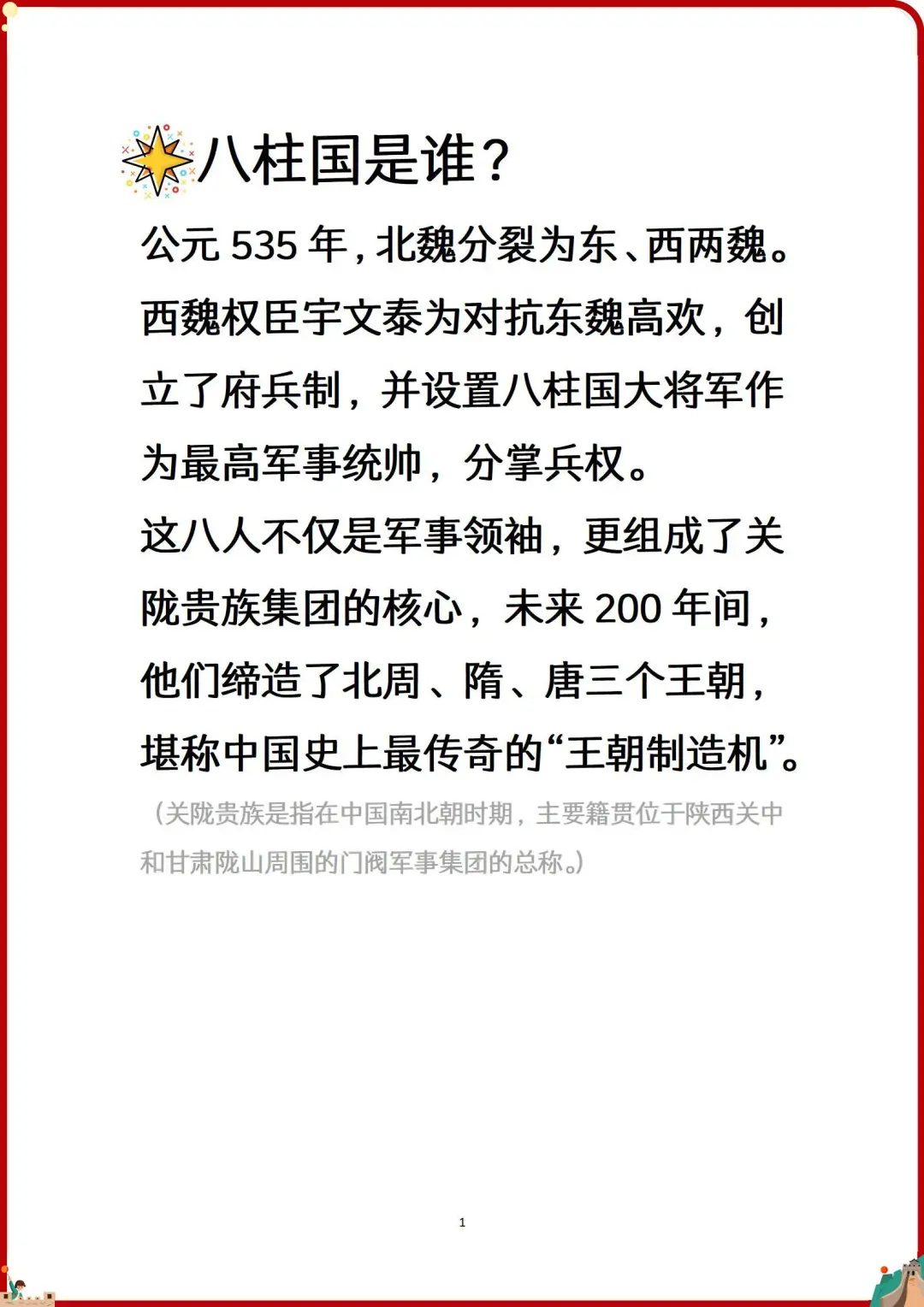 [吧唧R]八柱国是起于北魏六镇。是北魏权臣尔朱荣创建,由一代权臣宇文泰发扬光大。最终成为中国历史上最大的军政团体关陇集团。这个军政团体在其最巅峰的时候,创建了出现三个王朝(北周,隋,唐)势力一直延续到武则天时期。