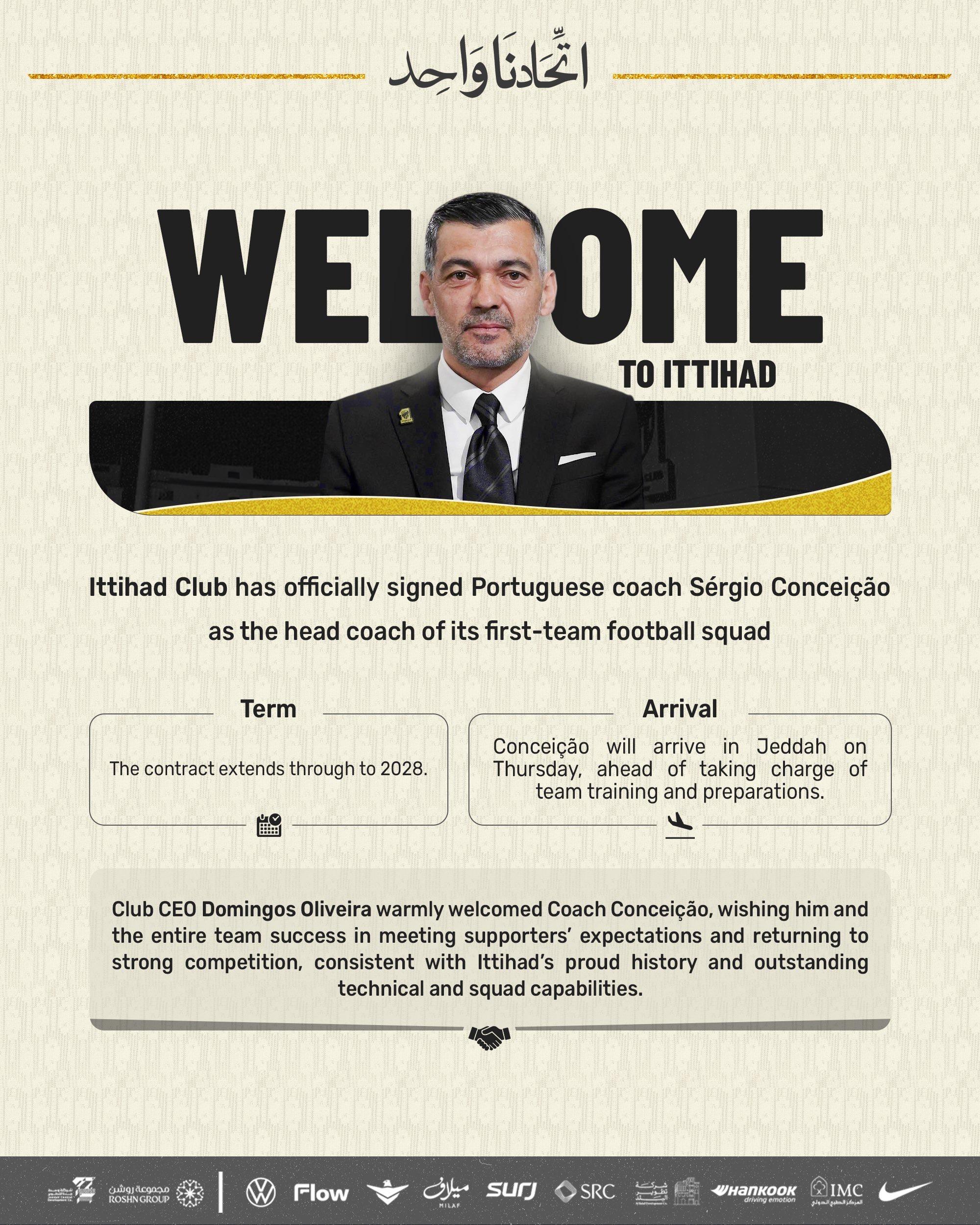 虎扑10月08日讯沙特吉达联合俱乐部官方宣布,葡萄牙教练塞尔吉奥-孔塞桑(SérgioConceição)出任球队一线队主教练,合同期至2028年。