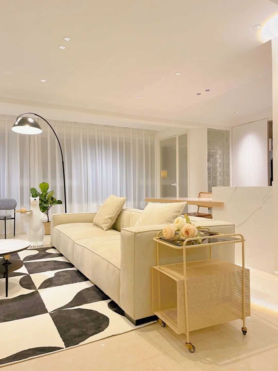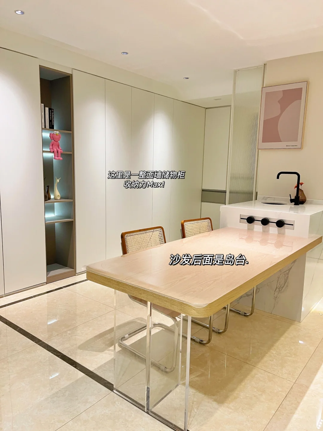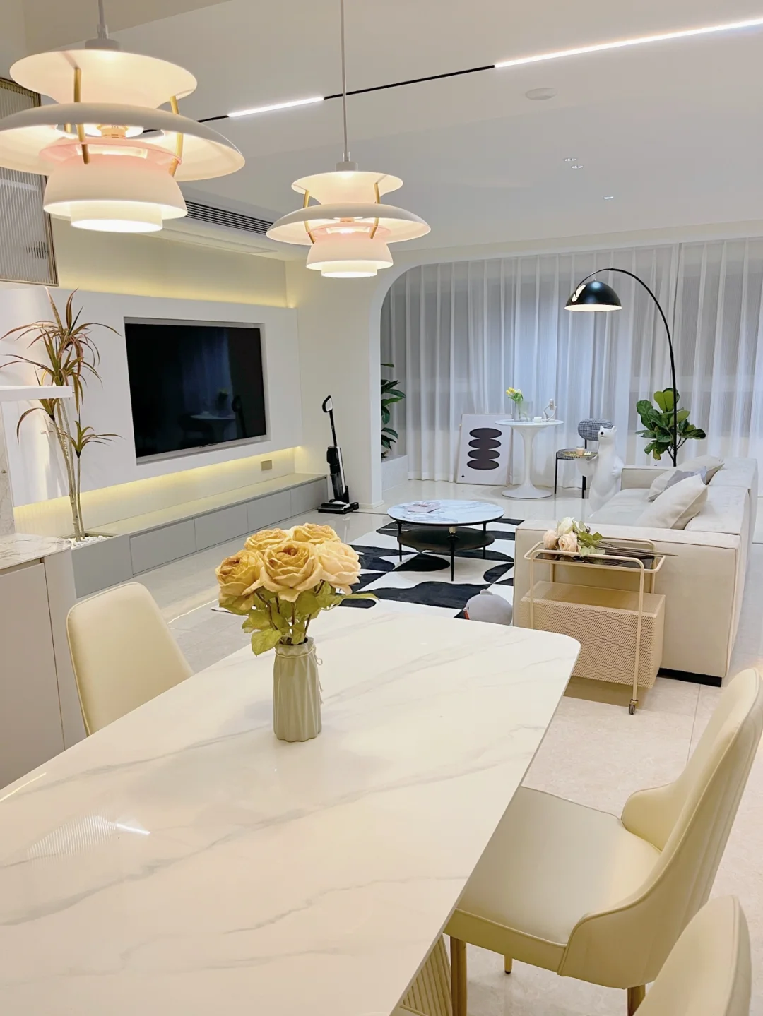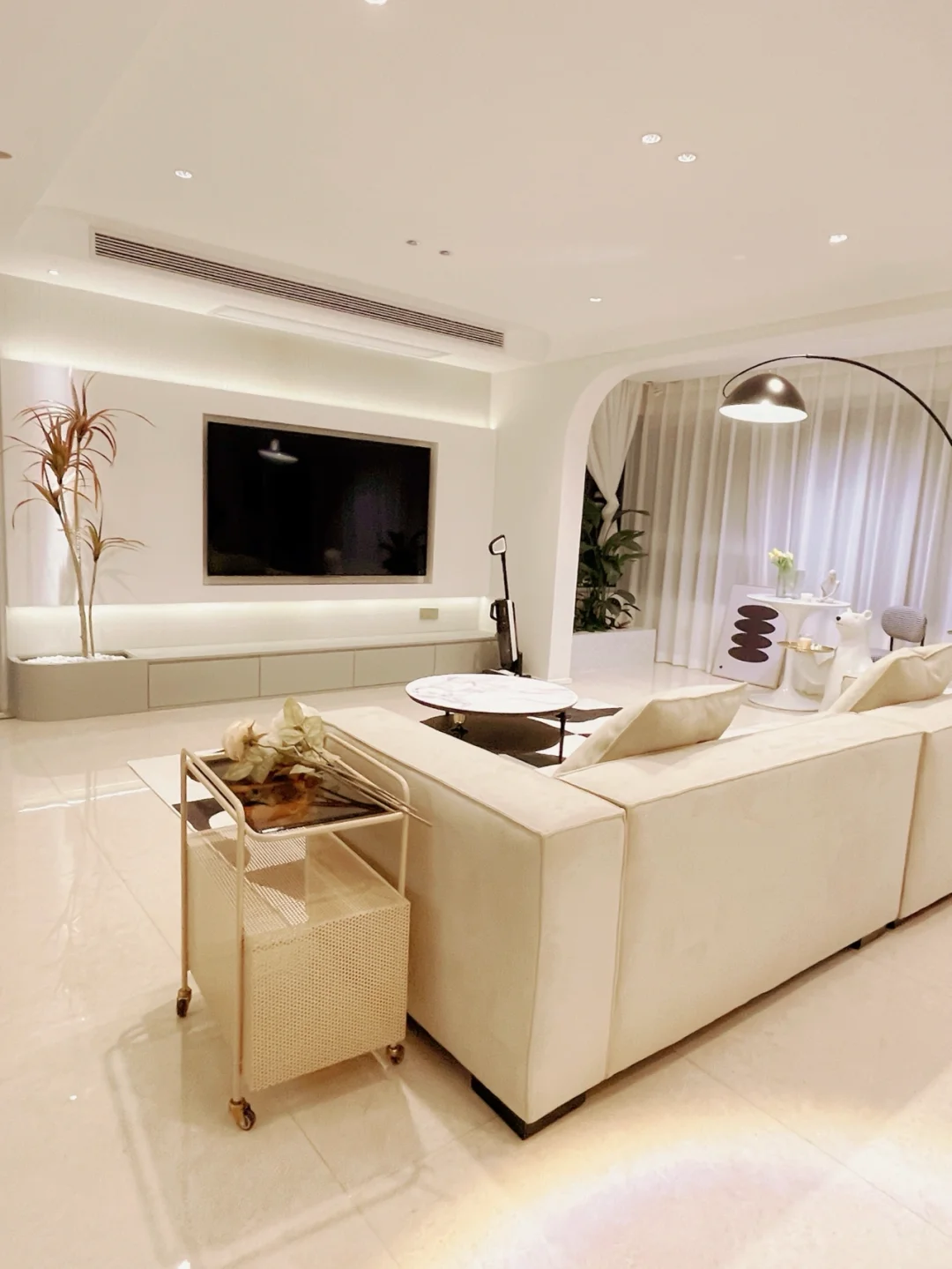 哈喽,宝子们~ 之前有宝子说我家看起来有200平、300平的 其实真的只有120平[微笑R] 🌟硬装阶段也花了一些小心思,让整个家视觉上显大❗️ ✔️无主灯、无吊顶,如果你家层高低就选择无主灯吧,我家不到2.6m,视觉上一点也不压抑 ✔️阳台纳入客厅,现在买房阳台都算全面积了,不包进来实在是太亏了吧[笑哭R] 至于包进客厅怎么晾衣服的问题,我家单独做了洗衣房,感兴趣的可看我其他笔记! ✔️客厅收纳:客厅其实藏了一整排储物柜哦!图4⃣️就是! ✔️地砖通铺,别整门槛石,直接铺到阳台,简单大气! ✔️全屋浅色系,从墙面到软装,都选择的奶油系,光线好又温柔。这次地毯大胆滴跳了个色,感觉又像换了一个家[微笑R] 还有宝问我全屋浅色系,卫生一定很难打扫吧[笑哭R] 其实浅色系真的不显脏哦,晚上拿着洗地机轻松走一遍,吸尘同时又能拖地,每天花个十五分钟,家里基本就能保持闪闪发亮! ✔️餐边柜好久没出镜了,木工打的柜体、定制的柜门,转角处还特意做成了弧形,有娃家庭可以借鉴!旁边的餐桌最近也刚换成了白色系,整体风格和我家更搭,岩板材质也比之前的更好清理! 💛其实我家客厅还有很多设计小心机,不知道你有没有看出来呢[斜眼R]欢迎评论区回复我哦!