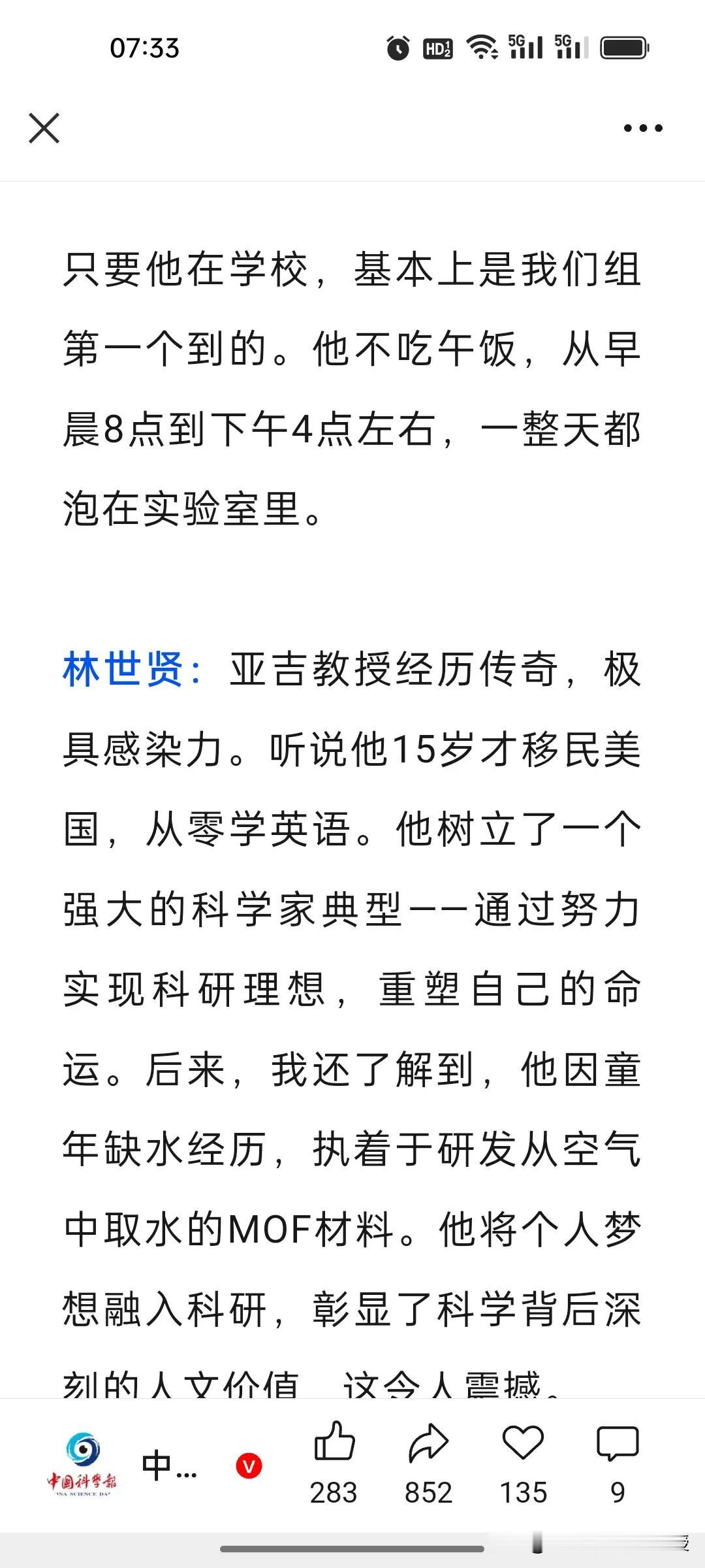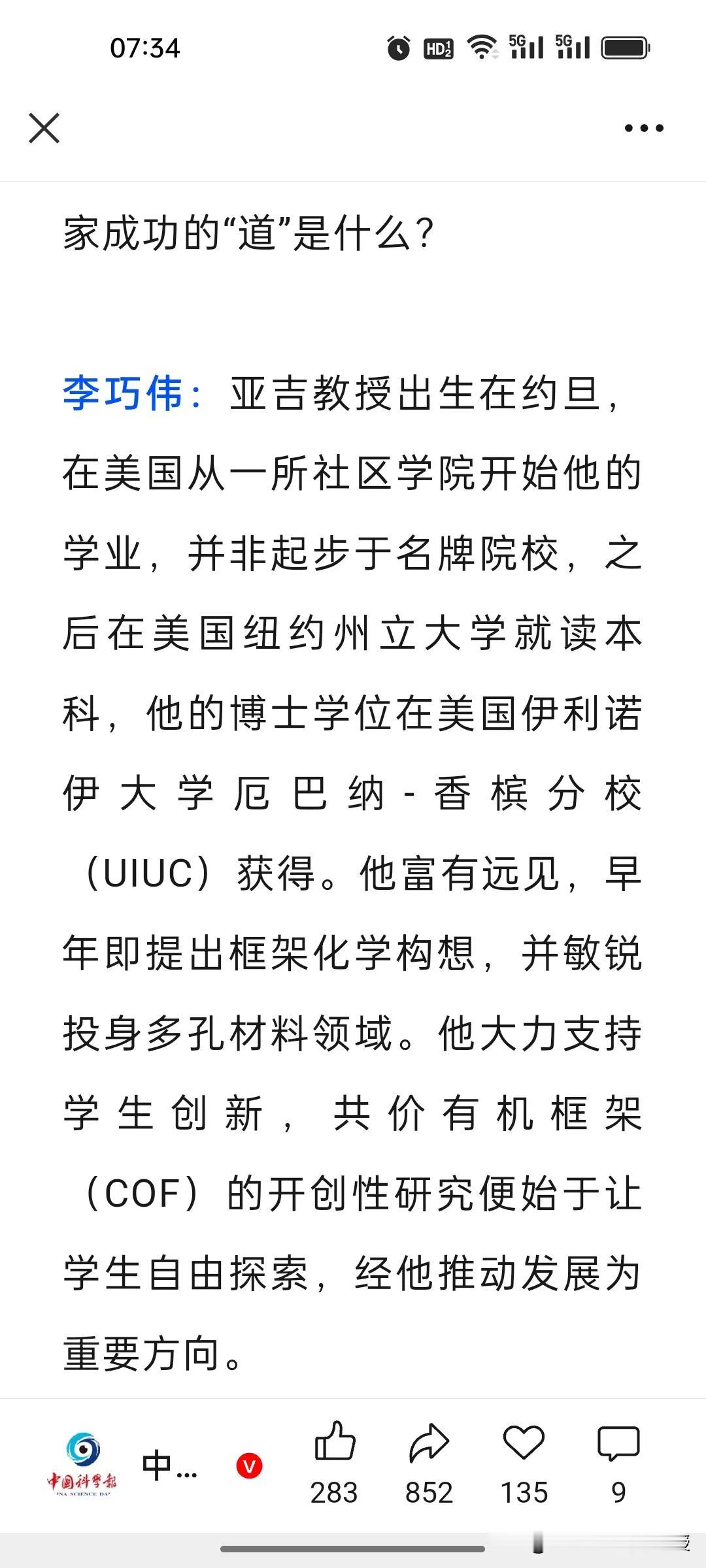 《中国科学报》对于今年的诺贝尔化学奖得主亚吉,说了一句大实话:“科学界,第一学历不重要”! 在中国各单位招聘中,第一学历985/211已经成了HR招聘人的第一道筛选门槛,不管你多有才华,在校招时候,第一学历985/211已经成了逃避不了的敲门砖,当然今年宇树科技创始人王兴兴第一学历也不是浙大,他的企业在招聘员工时就不以第一学历论英雄。 《中国科学报》说的没错,在科学界并不是以语数英总分来评判科学家是否优秀。亚吉是约旦人,15岁移民美国才学英语,美国的一所社区学院开始学业,不是大家眼中的学霸门门都好的“标准件”,可是他后发制人,在自己的领域最后取得了举世瞩目的成就。 这又让我想起前几天丘成桐教授在演讲时说的,不要那些只会刷奥数题的数学天才,而是要发现那些真正有潜力的数学人才去培养。