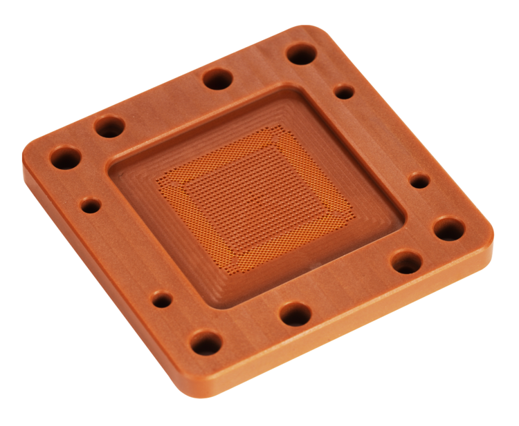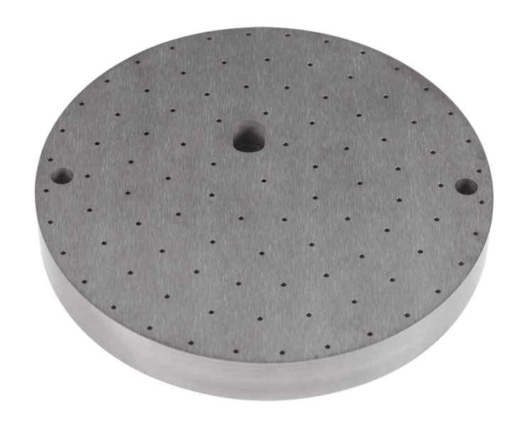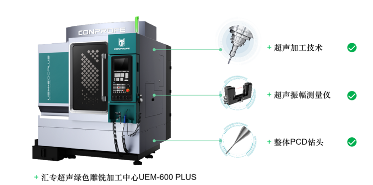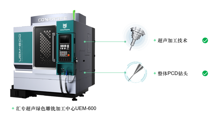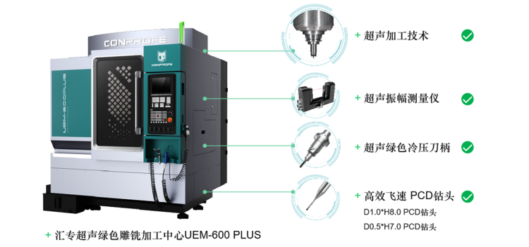 硬度高达HV3,150的CVD碳化硅喷淋盘具有高硬脆的难加工特性,因加工周期长、加工成本高、工件易崩缺、刀具易损耗等问题长期依赖国外进口。汇专通过超声绿色雕铣加工中心UEM-600PLUS+超声加工技术+超声振幅测量仪+超声绿色冷压刀柄+高效飞速PCD钻头的组合方案,将D1.0/D0.5mmCVD碳化硅喷淋盘阶梯孔的单孔加工时间从11分25秒缩短至5分58秒,加工效率提升47.8%,刀具寿命提升160%,加工成本降低50%,显微镜放大至50倍检测,孔口崩边量≤0.02mm。
