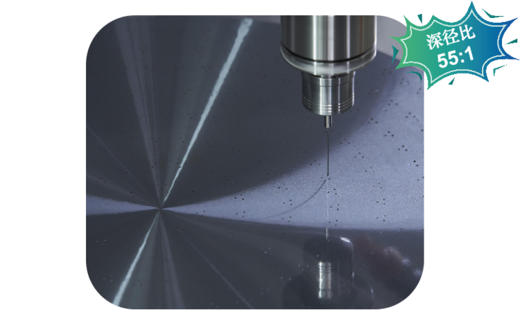 单晶硅是典型的硬脆性材料,加工中容易产生崩缺问题,导致工件报废率高,而对于孔深径比高达55:1的单晶硅曲面电极,更是进一步增加了加工难度。对此,汇专采用超声绿色雕铣加工中心UEM-600+超声加工技术+整体PCD钻头的配套解决方案,对单晶硅曲面电极进行钻孔加工,可连续加工超过1,000个D0.45x24.75mm的超深微孔(深径比55:1),入口处目视无崩边,孔真圆度达0.003mm,孔壁粗糙度Sa从6.540μm降低至0.013μm,降低99.8%。