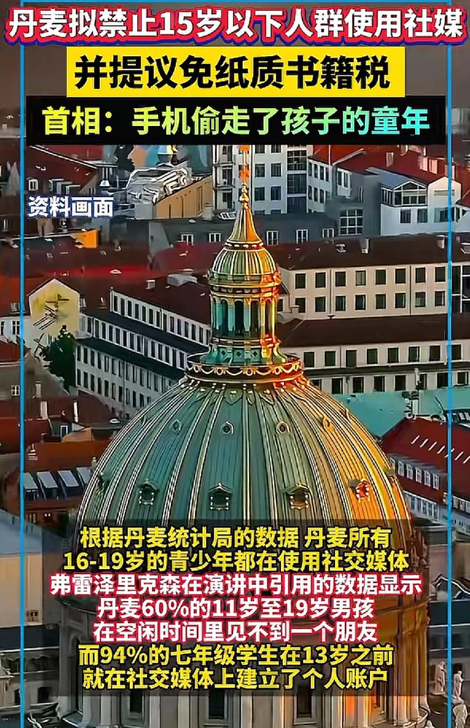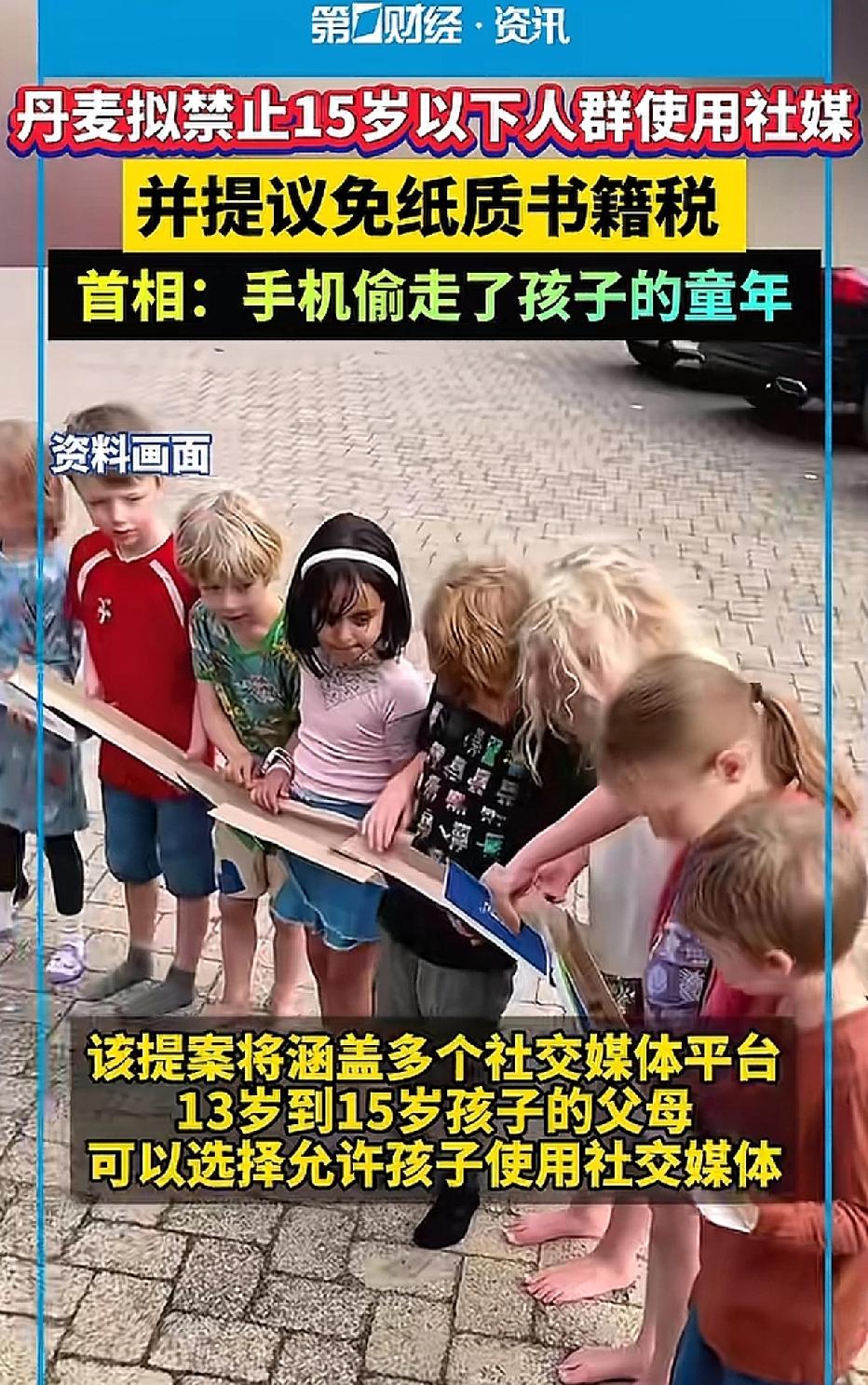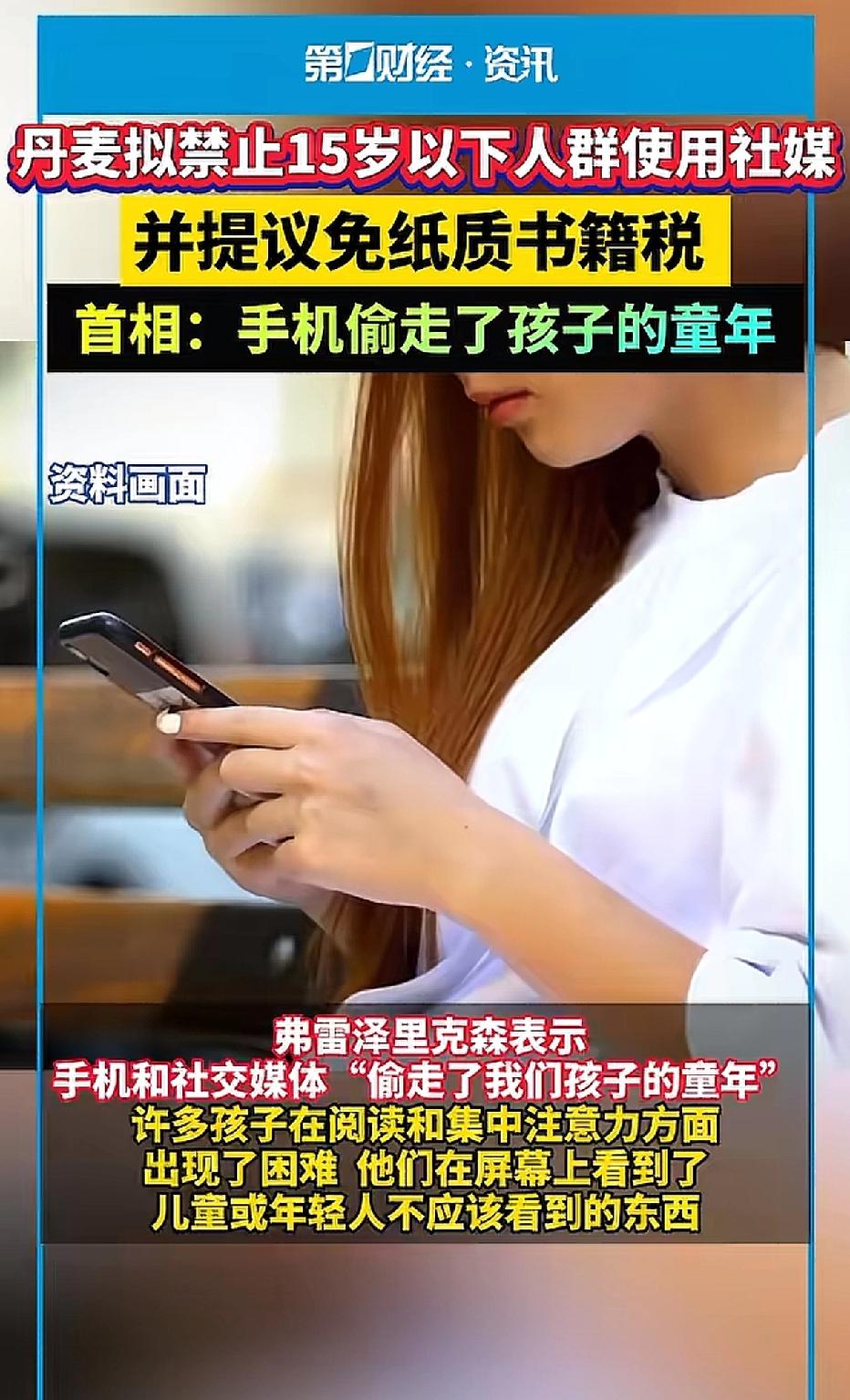丹麦将禁止15岁以下孩子使用社交媒体软件,这一提议由丹麦首相提出。 她表示:“手机偷走了孩子的童年,让许多孩子出现阅读障碍。” 今年八月,这位首相已免除纸质书籍25%的税。 她又说:13到15岁之间的孩子,可以在父母的允许下,使用部分社交软件。 丹麦首相是一位女士,也是一位母亲,她从母亲的视角看待这些问题。 这也是众多母亲焦虑之处。而在我国,有些母亲做得很好,她们的孩子既能使用手机,又不耽误学习。 手机没错,社交软件和游戏也没错,错在如何引导孩子合理使用。 手机社交软件与游戏的出现,变相淘汰了那些意志力薄弱的人。 时代在飞速发展,科技在不断进步。谁也无法阻挡科技时代的到来和互联网的广泛应用。 当孩子首次使用手机时,父母就要与孩子制定规则,这才是解决问题的办法。 我是赞同这位女士的提议,但是这样的提议很难进行到底,毕竟以孩子们的聪明智慧,只要他们想,会有很多方法登录社交和游戏软件的。 来源:红星新闻