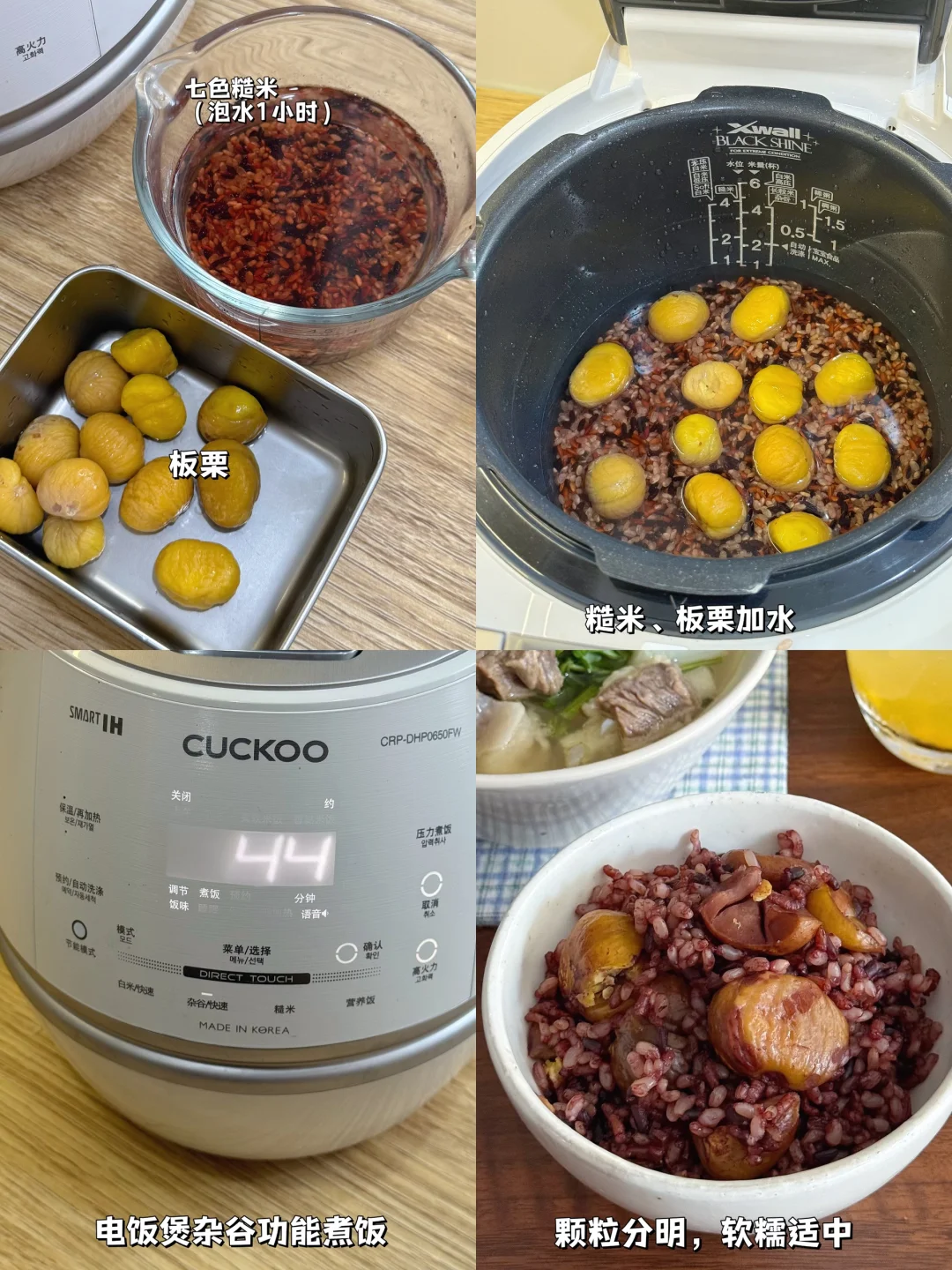 🥘牛肉炖得酥软,萝卜吸饱汤汁清甜可口。🌰糙米板栗饭——米粒饱满Q弹,板栗粉糯香甜,入口满是秋日的温柔。一个人吃饭也可以有具像化的幸福,今天这顿谢谢靠谱的“厨房搭子”——福库小白贝电饭煲。