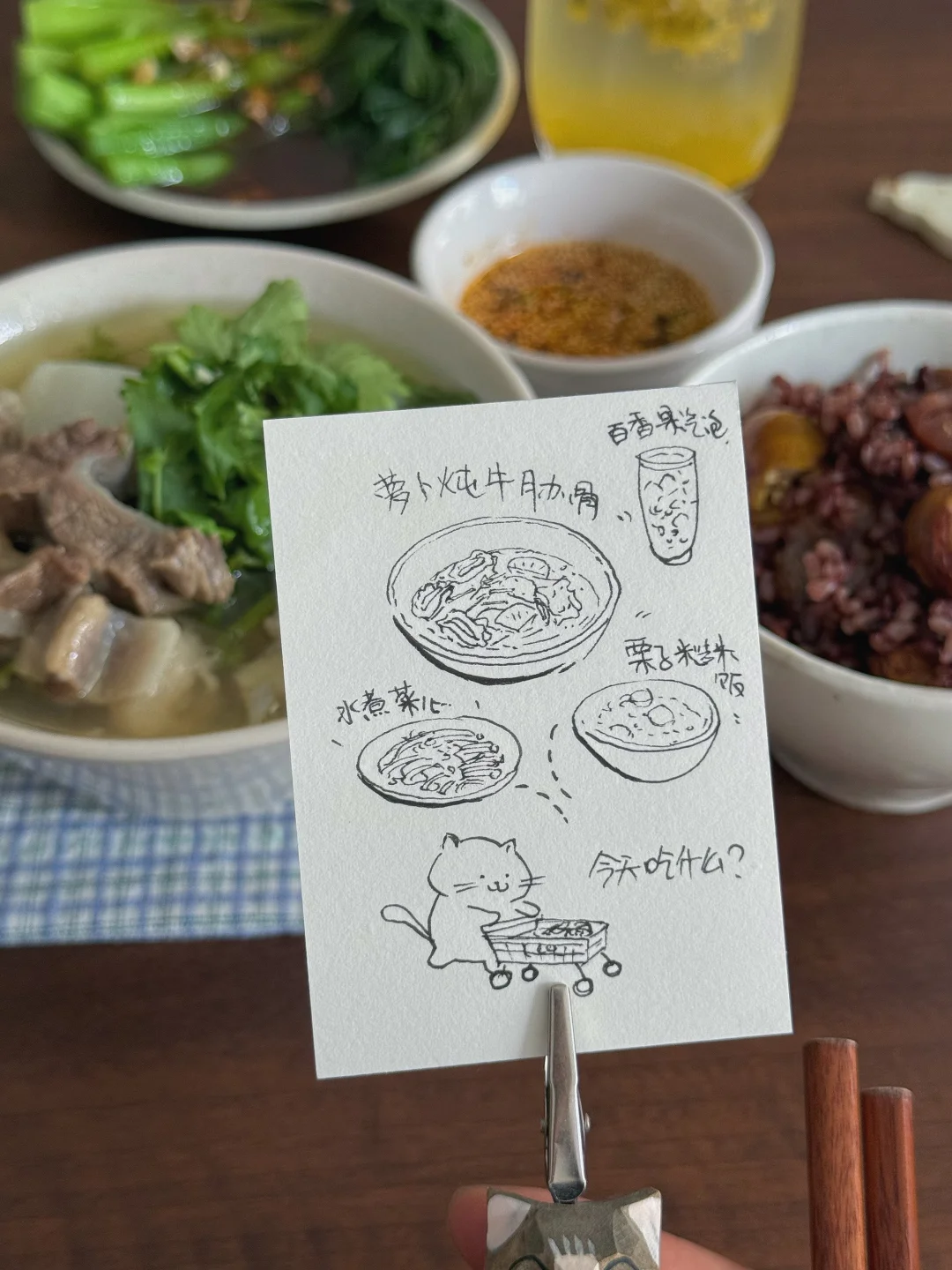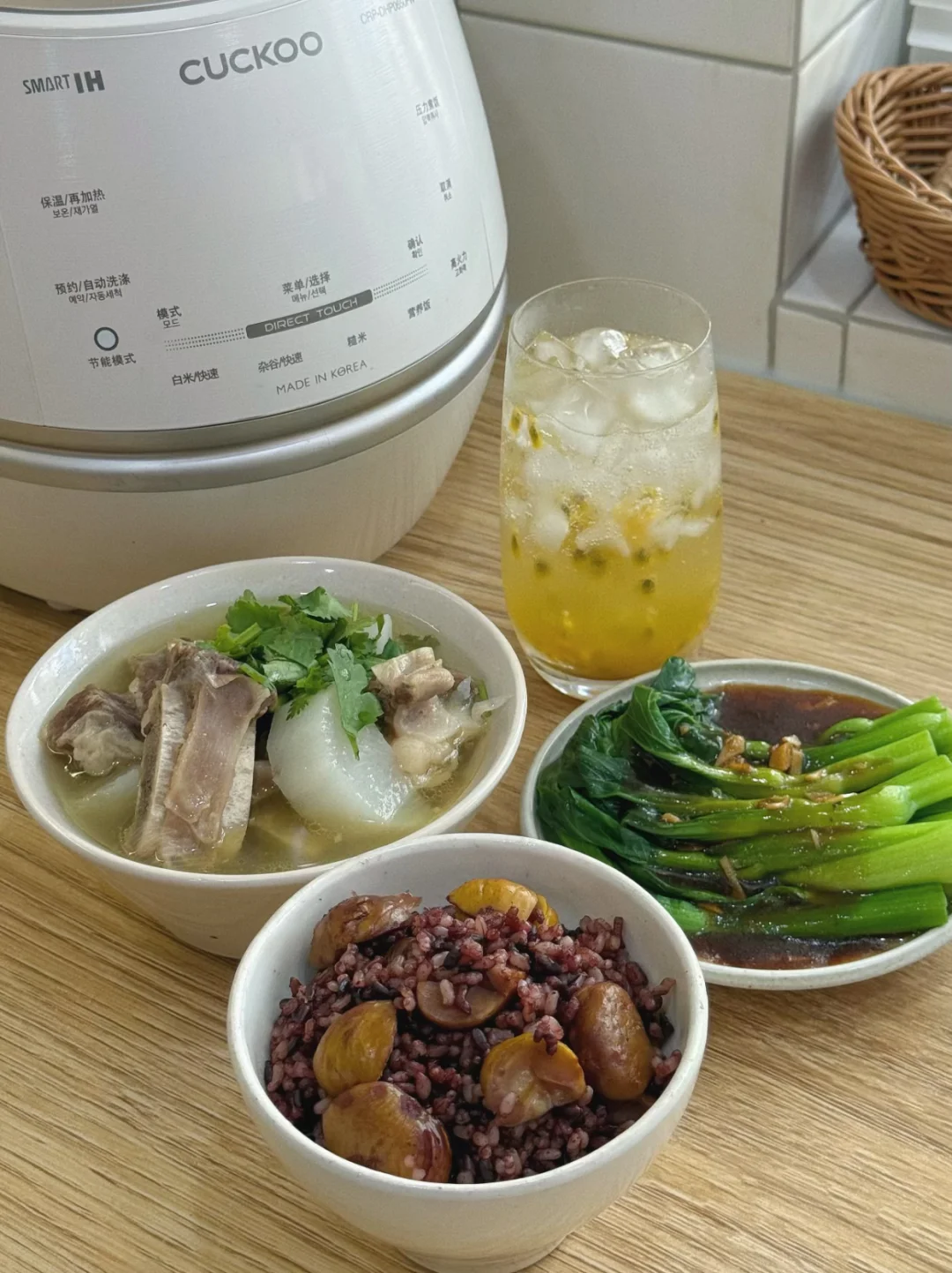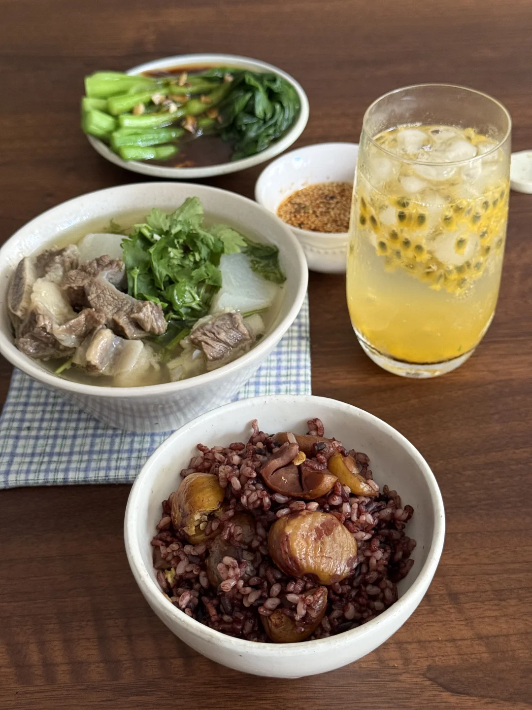 今日美食:萝卜炖牛肋骨,糙米板栗饭,蚝油青菜,百香果气泡