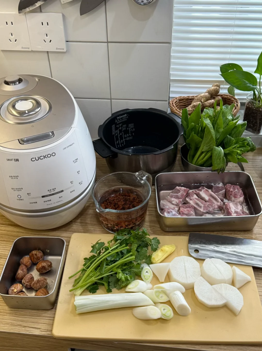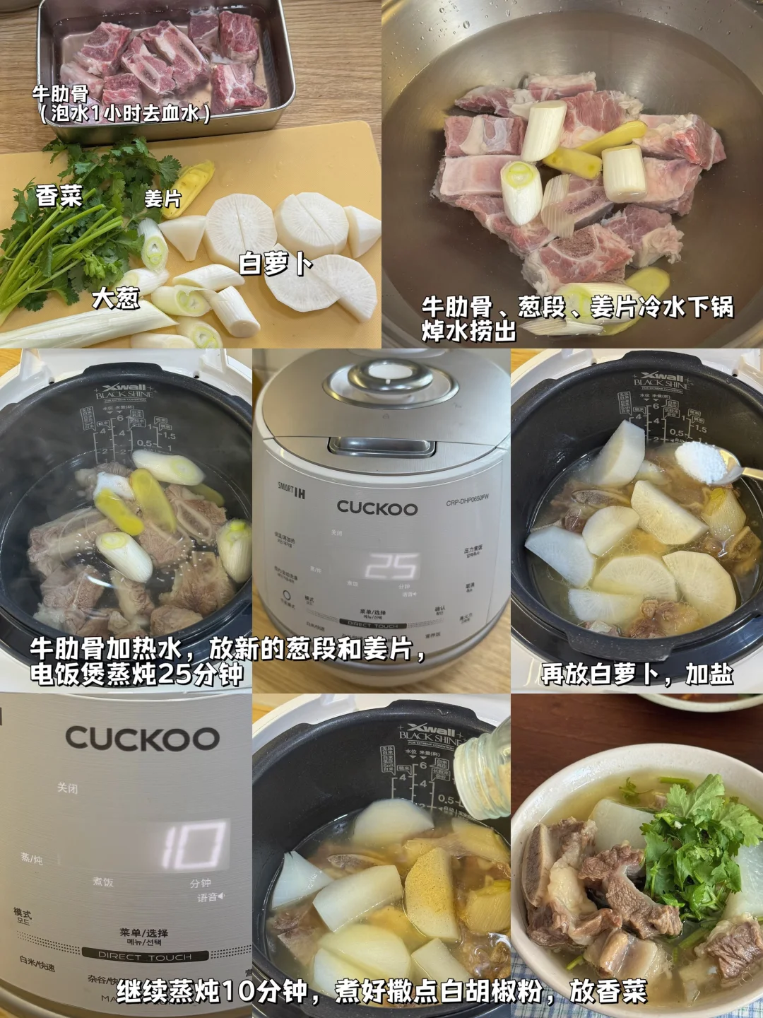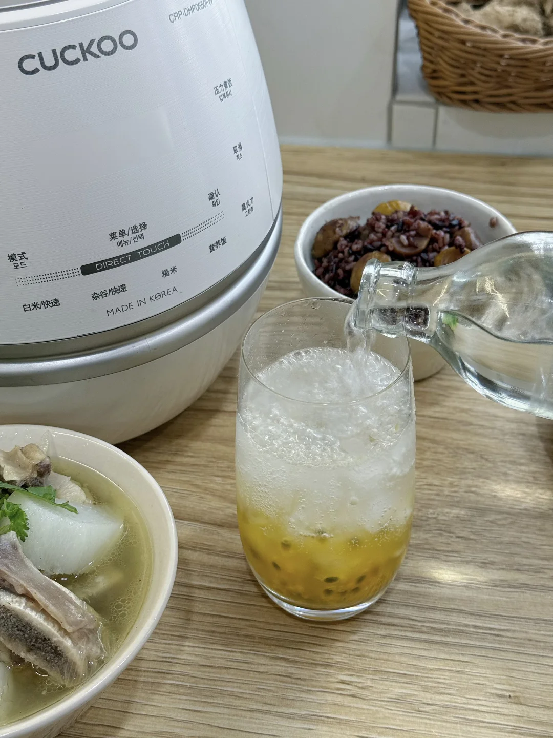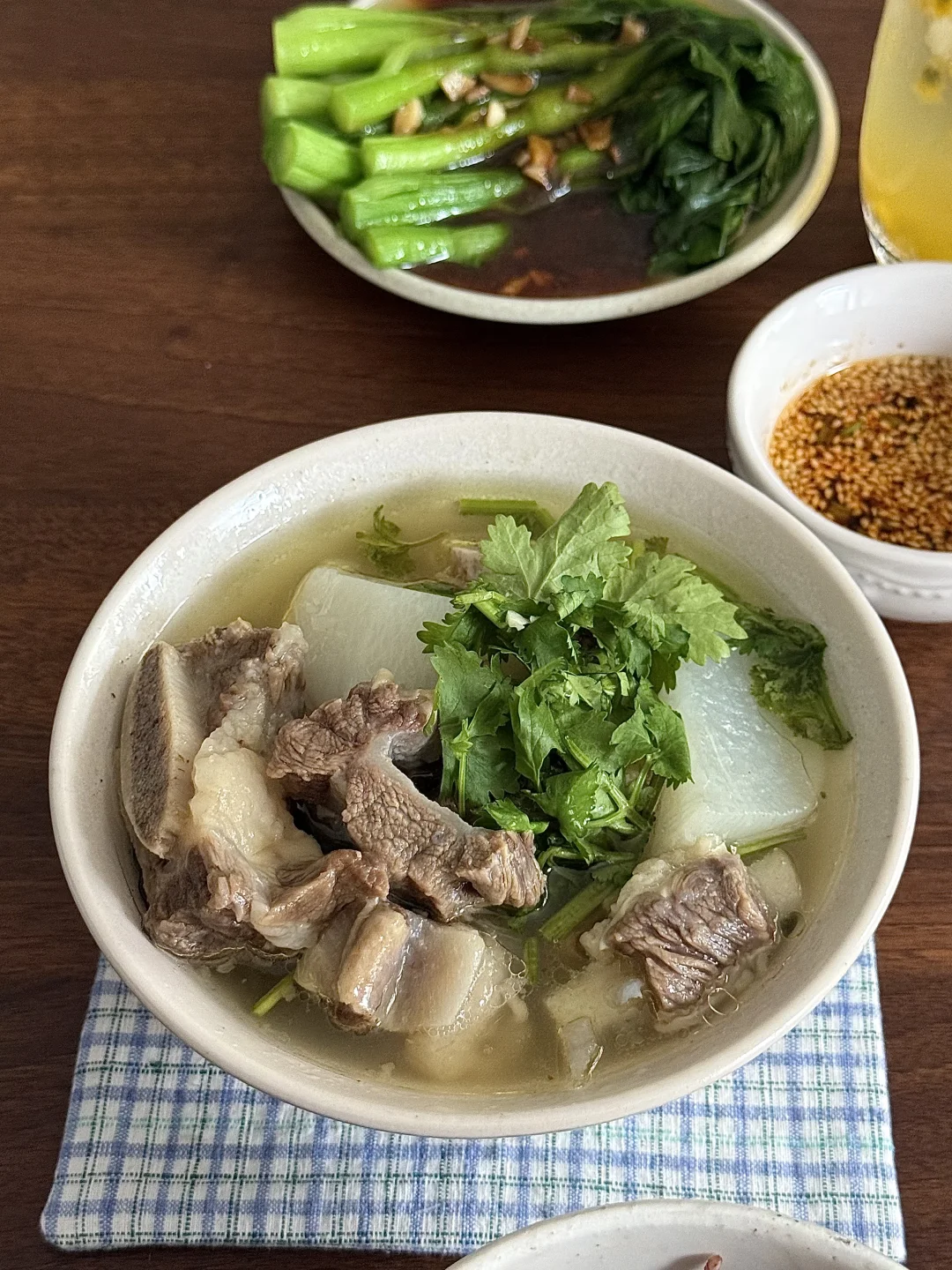 今日美食:萝卜炖牛肋骨,糙米板栗饭,蚝油青菜,百香果气泡