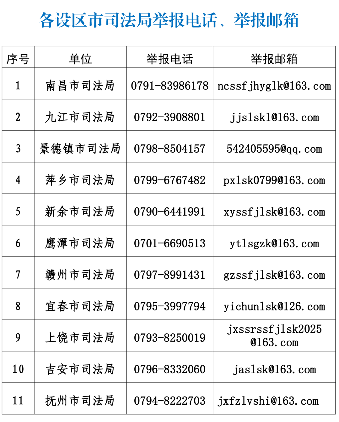 (二)电子邮箱举报。可将问题线索发送至设区市司法局电子邮箱(邮件主题请注明“问题线索”)。