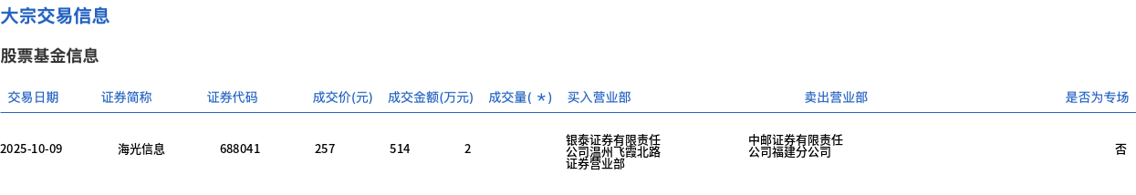 10月9日,海光信息大宗交易成交2万股,成交额514万元,占当日总成交额的0.04%,成交价257元,较市场收盘价263.05元折价2.3%。
