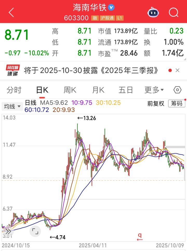 国庆长假后的首个交易日,海南华铁遭14亿元卖单封死跌停,报8.71元/股,给22万股民留下“一地鸡毛”。