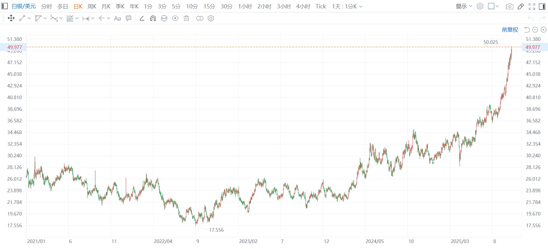 格隆汇10月9日|现货白银涨势凶猛,向上突破50美元/盎司整数关口,创历史新高,今年迄今累涨逾21美元,年内涨幅73%。