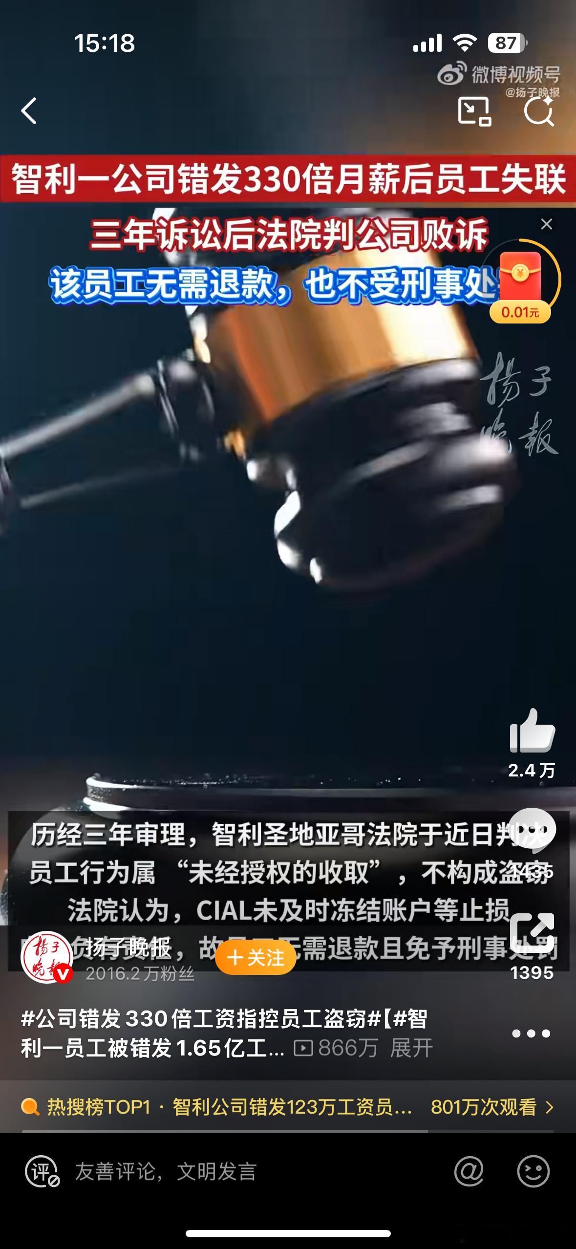 智利公司错发123万工资员工被判不退款 算了一下 大概相当于这位员工27年半的工资了 这么多钱直接可以退休了吧 感觉压力要给到发工资的人了
