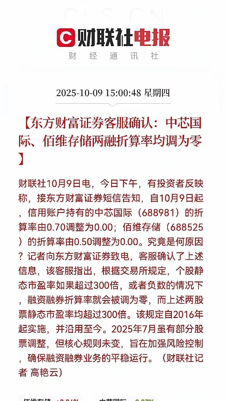 大瓜!芯片圈突遭"融资锁喉",中芯、佰维被"清零",300倍市盈率成红线? 家人们谁懂啊!刚给半导体芯片加完鸡腿,就被东方财富一盆冷水浇透心凉! 下午3点整,行情软件突然弹出"重磅炸弹":10月9日起,中芯国际、佰维存储的两融折算率直接从0.7、0.5砍到0,主打一个"一毛不剩"!理由特直白——静态市盈率超300倍,不符合规则。 这消息一出来,股民群里直接炸锅:有人刚加完杠杆准备冲,结果融资通道先"断网";有人盯着持仓懵圈,这波操作等于被卸掉"交易武器"。更让人揪心的是,A股科技板块里,市盈率超300倍的公司可不少,这俩会不会是"开头菜"? 虽说东方财富解释是"按规矩办事",可偏偏赶在半导体火得发烫的时候动手,这不就像火锅正沸腾,突然被抽了燃气灶?要知道现在两融规模都快追上2015年高峰了,这一调整,明天芯片板块怕是要上演"过山车"。 手里捏着芯片股的朋友,今晚可得提前备好"降压药",毕竟股市的惊喜(惊吓),永远比外卖来得快!大家觉得这波调整是短期震荡,还是连锁反应的开始?评论区聊聊你的看法! #中芯概念股# #中芯国际市值# #中芯国际#