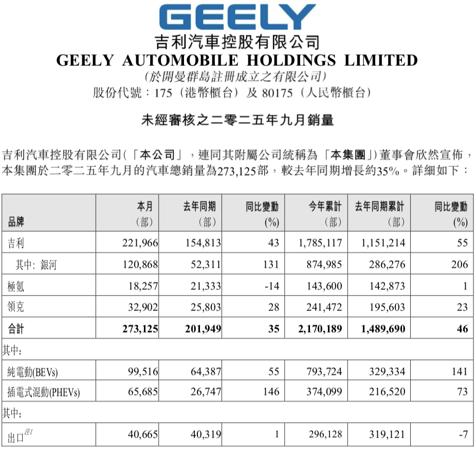另据最新数据显示,今年9月吉利汽车(包括吉利、银河、极氪、领克在内)的单月销量为27.31万辆,同比增长35%。目前吉利汽车旗下品牌包括吉利、银河系列、极氪、领克。细分来看,9月吉利品牌同比增长43%至22.20万辆;银河系列销量同比增长131%至12.09万辆;极氪品牌销量同比下滑14%至1.82万辆;领克品牌同比增长28%至3.29万辆。将时间拉长至今年前9个月来看,今年1至9月,吉利汽车(包括吉利、银河、极氪、领克在内)累计销量为217.02万辆,同比增长46%。其中,吉利品牌同比增长55%至178.51万辆;银河系列销量同比增长206%至87.50万辆;极氪品牌销量同比增长1%至14.36万辆;领克品牌同比增长23%至24.15万辆。此外,在国内市场大放异彩的同时,吉利汽车在海外市场也展现出较强的实力,今年前9月吉利汽车累计出口29.61万辆。