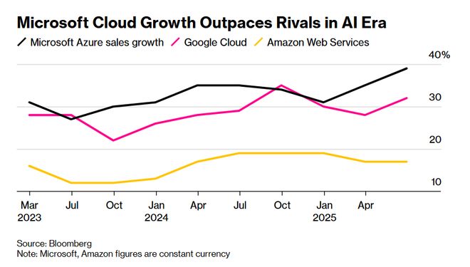 Azure是微软当前最为重要的增长引擎——该云业务在2025财年营收规模超过750亿美元。其云计算业务扩张速度甚至已大幅超过其最大竞争对手亚马逊公司(Amazon.comInc.)以及AlphabetInc.旗下的谷歌云平台(Google)。如上图所显示的那样,微软Azure云计算平台在AI时代的业绩增长持续跑赢大型竞争对手亚马逊以及谷歌。