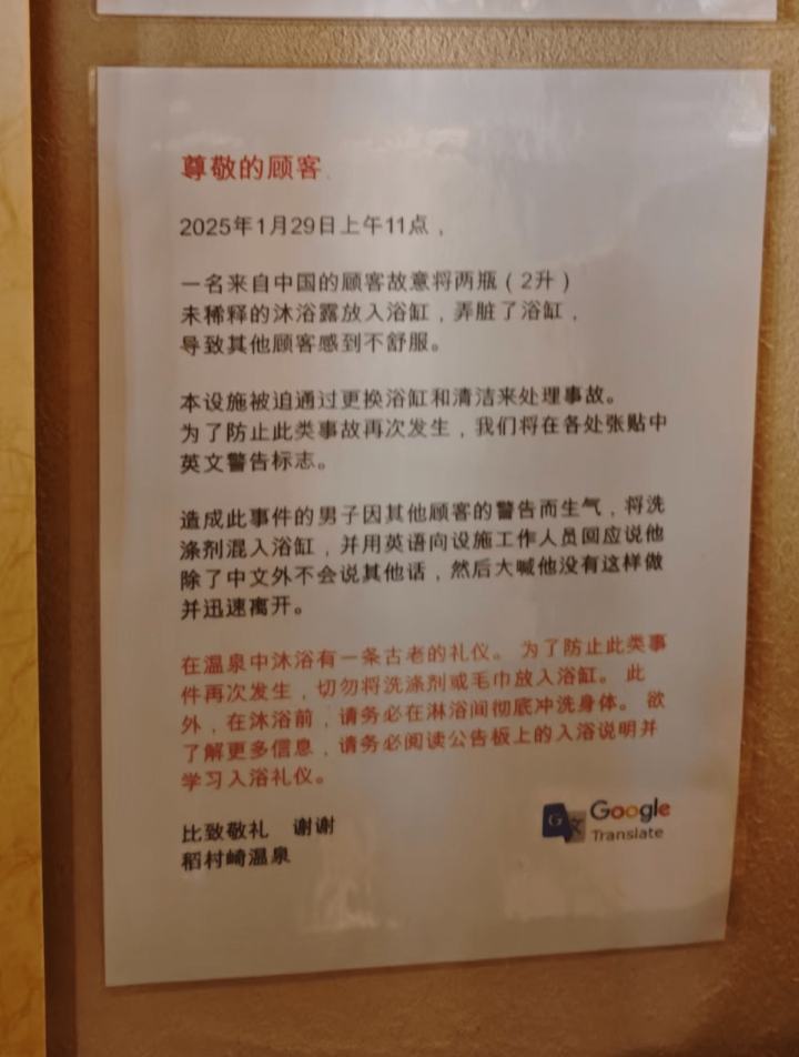近日,日本神奈川县镰仓市一知名温泉场所“稻村崎温泉”贴出公告称,一名中国男性旅客不满被纠正入浴礼仪,竟将2升未稀释的沐浴乳倒入浴池,导致其他使用者不适,也让温泉被迫暂时关闭。
