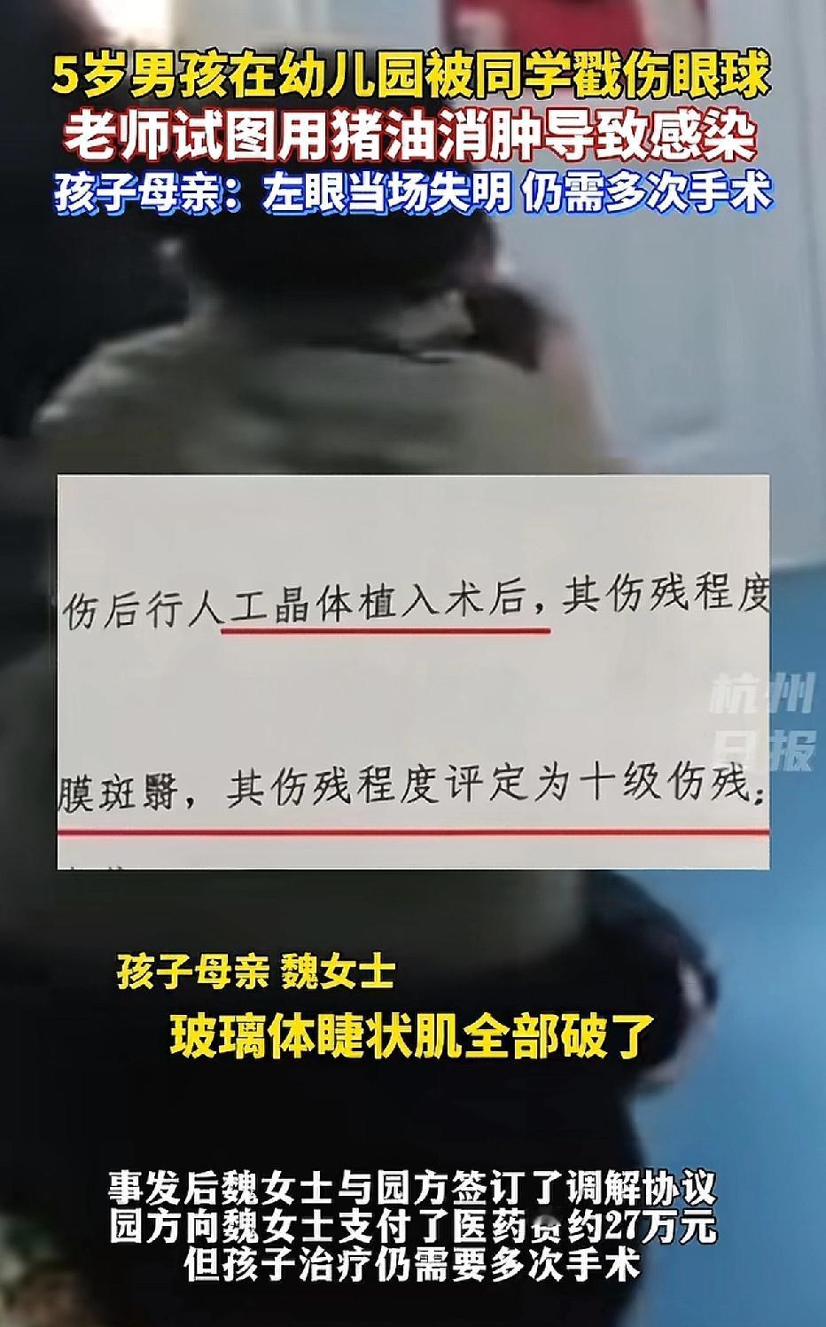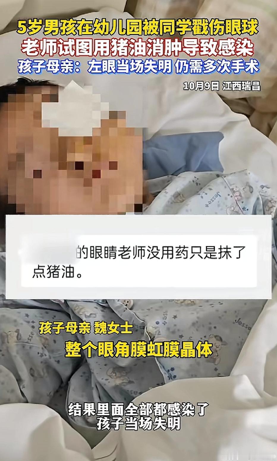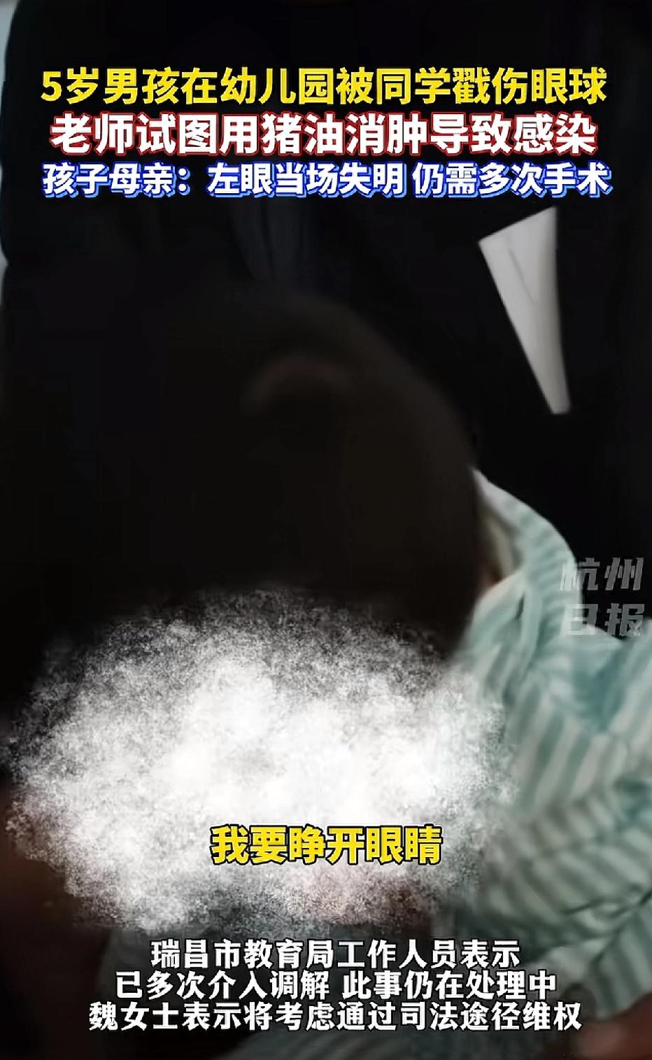 江西瑞昌,一名五岁男童在幼儿园被同学戳伤左眼球。令人意想不到的是,老师竟用猪油涂抹男童眼部,试图为其消肿,结果却导致男童眼球内部感染,最终失明。 视频中,眼部蒙着纱布的男童哭喊着:“太疼了,我要睁开眼睛。”那凄惨的声音,实在让人揪心。 男童的爸爸抱着他,妈妈则拉住他抓向纱布的手,夫妻俩一边流泪,一边轻声安慰着孩子。 经鉴定,男童构成十级伤残,后续需经历多次手术,能否痊愈仍是未知数。 孩子受伤时,老师本应立刻拨打120并联系家长,如此自行处理的情况实属罕见。 老师虽一片好心,却给幼儿园添了麻烦,也让自己陷入了一生的愧疚之中。 经协商,幼儿园支付了男童27万的医药费。 目前,尚不清楚戳伤男童的同学家长是否进行了赔偿。 每个孩子都是家庭的希望,父母满怀信任地将孩子送进幼儿园,期望的是孩子能在园里得到呵护、健康成长,而非遭遇意外的伤害。 在此,恳请每一位幼师和家长都能铭记这一教训:孩子的伤口绝非“小事”,切勿擅自处理,寻求专业的医疗处置才是对孩子真正的负责。 来源:杭州日报
