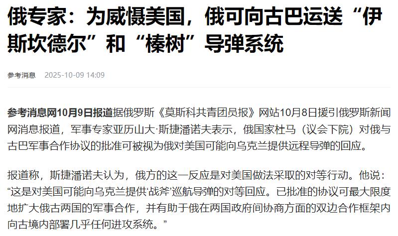 俄警告把“榛树”弹道部署古巴,美内部很恐慌,就连亲信都出面劝说特朗普放弃向乌提供战斧导弹。 俄罗斯在10月9日通过媒体放出消息,要是美国非要给乌克兰送“战斧”巡航导弹,那俄罗斯就不客气了——考虑把“伊斯坎德尔”导弹和“榛树”防空系统运到古巴去。 “伊斯坎德尔”是俄军现在的主力战术导弹,射程能到500公里,常规弹头、核弹头都能装,打目标准得很。要是真部署在古巴,美国东南部一大片地方都得在它的打击范围内。 而“榛树”防空系统也不含糊,中短程的空中目标它都能拦下来,这两套家伙事儿凑一块儿,对美国本土安全的威胁可不是闹着玩的。 美国这边慌成这样也不是没道理,从地图上看古巴跟美国佛罗里达州就隔了一片海,最近的地方还不到200公里,现代导弹飞这么点距离也就是分分钟的事儿。 更关键的是,这场景让人想起以前差点引发核战争的“古巴导弹危机”的紧张局面,当时那种一触即发的氛围,不少美国老政客到现在想起来还后背发凉。现在眼看着历史可能要重演,美国政府内部不乱才怪。 对特朗普政府来说,现在真是左右为难。一方面,给乌克兰“战斧”导弹是援助计划里的重头戏,有了这东西,乌军的远程打击能力能上一个大台阶;可另一方面,俄罗斯的反制招儿直接戳到了美国的痛处——本土安全受威胁,这个风险实在太大了。 而据消息灵通人士说,最近好几位特朗普的核心手下天天找他谈,翻来覆去就说一件事:国家安全才是头等大事,对乌援助得掂量着来,可不能捡了芝麻丢了西瓜。 俄罗斯这手反制真是打在了美国的要害上,古巴就像美国的“后花园”,地理位置太敏感了,在这儿部署先进导弹,等于直接把美国的战略空间压缩了一大块。 而且美国国内的政治情况本来就复杂,碰到这种直接威胁安全的事儿,各个派系的意见马上就不一样了,这让本就不是铁板一块的美国“挺乌派”更加的分裂。 现在的美国政府又一次站在了历史的十字路口上,要是硬着头皮给乌克兰送“战斧”,那本土就得扛着被导弹瞄准的风险;可要是认怂不送了,又等于在跟俄罗斯的较量中退了一步。 这种两难的处境也让外人看明白了,国际政治这事儿真不是随便拍脑袋就能决定的,每一步都得算清楚利弊,稍微有点差池,就可能闹出没法收拾的后果。 眼下这局势这么微妙,美国最后到底会选哪条路,确实值得所有人关注。