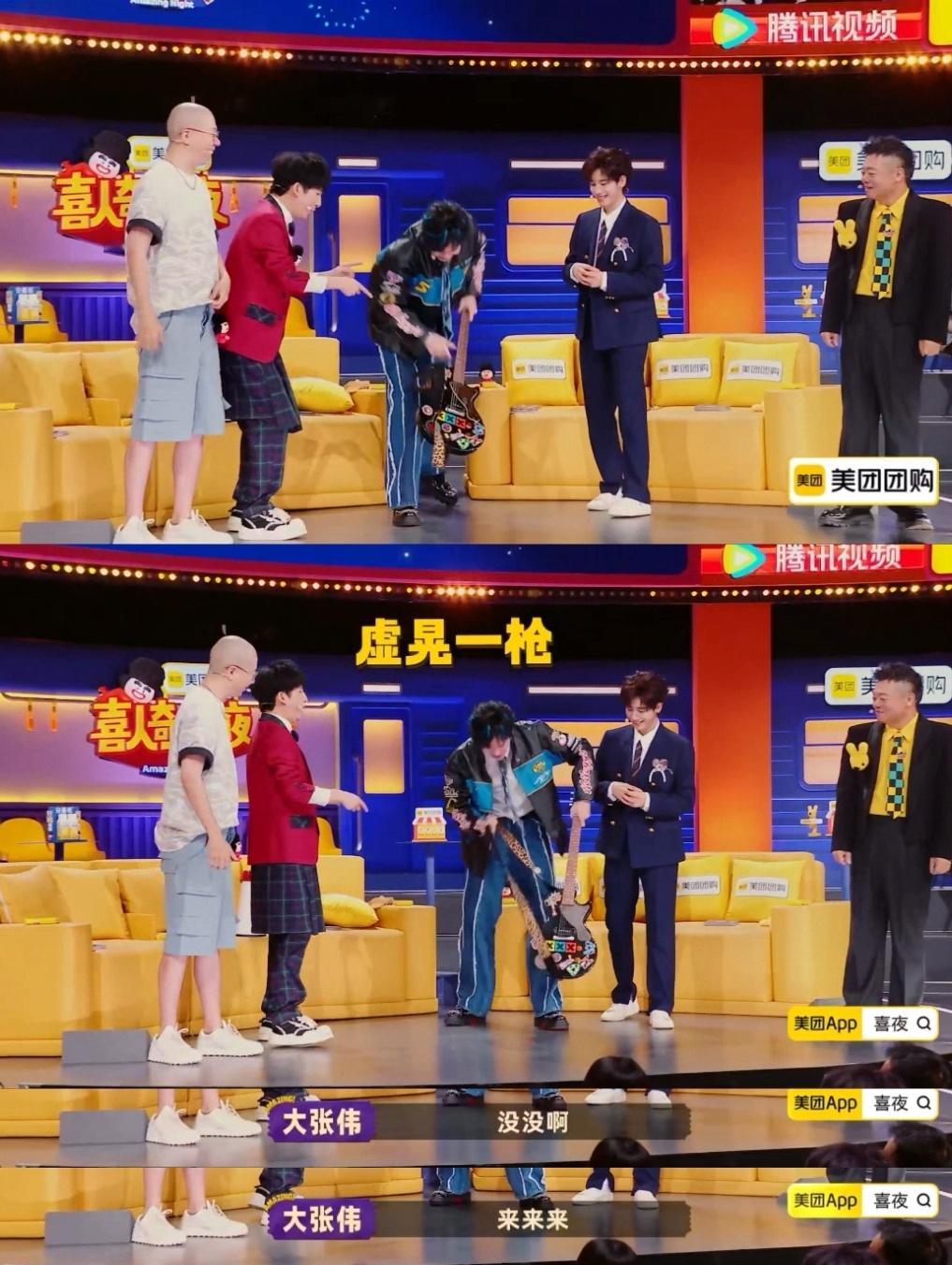 大张伟心率因为张若昀这一下180 瞧瞧这热闹场面,张若昀突然cos大张伟,还煞有介事地拿起吉他玩起“假摔”,这突如其来的操作,直接把大张伟吓得心率飙升到180,现场气氛瞬间拉满!