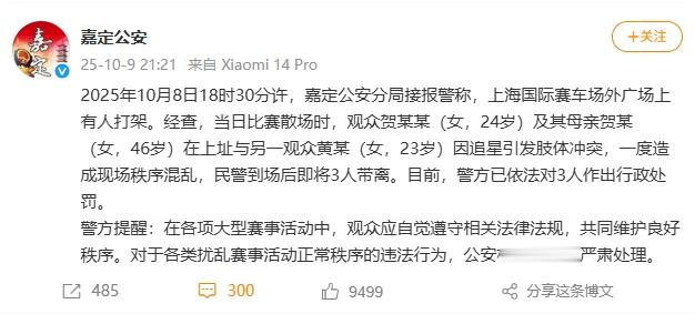 2025年10月8日18时30分许,嘉定公安分局接报警称,上海国际赛车场外广场上有人打架。经查,当日比赛散场时,观众贺某某(女,24岁)及其母亲贺某(女,46岁)在上址与另一观众黄某(女,23岁)因追星引发肢体冲突,一度造成现场秩序混乱,民警到场后即将3人带离。目前,警方已依法对3人作出行政处罚。