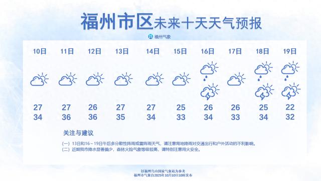 气温:10日到16日,全市午后最高气温较高,福州市区和内陆县区的日最高气温可达34~36℃,沿海城区为32~34℃;17日起,全市日最高气温略下降,为31~34℃。