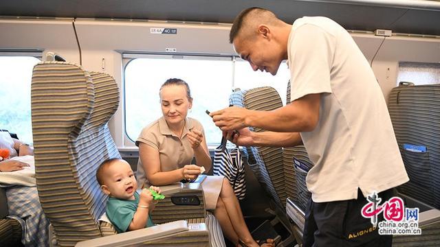 10月9日,在D6342次动车上,旅客唐先生(右一)与来自乌克兰的妻子正在同孩子玩耍。胡国林摄