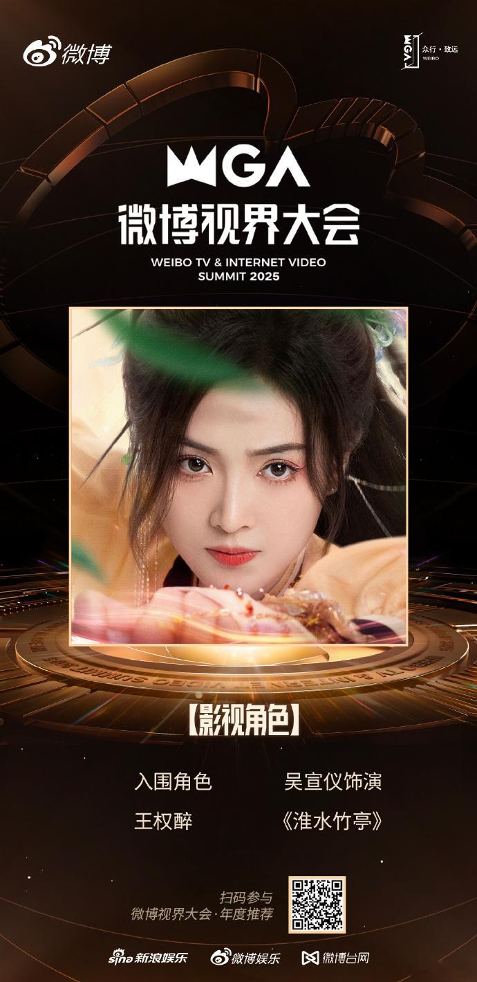 吴宣仪王权醉入围视界大会年度推荐 吴宣仪凭借《淮水竹亭》王权醉角色入围微博视界大
