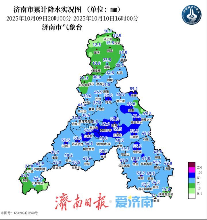 根据气象和水文观测站网统计,2025年10月9日20时至2025年10月10日16时降水量(毫米):全市平均39.1(高新区泰和小学最大69.9),折合水量约4.0亿立方,市区44.3(历下区龙洞站最大65.5)、历城区52.0、长清区41.1、平阴县28.5、济阳区31.3、商河县15.3、章丘区47.3、莱芜区45.5、钢城区29.6、高新区52.7、南山区45.1、起步区32.4。全市200个测站中有163个雨量超过25毫米,其中有32个雨量超过50毫米。