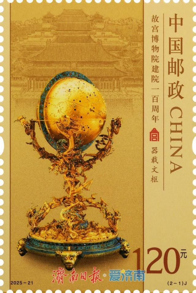 其中,第一枚邮票“器载文枢”以“金嵌珍珠天球仪”为主体视觉元素。“金嵌珍珠天球仪”工艺精湛、造型独特,是故宫珍贵文物的代表之一。同时,画面上方巧妙融入故宫神武门及周边宫殿群,直观展现出故宫建筑群气象万千的宏大气势,将文物之美与建筑之雄完美结合,生动诠释了故宫作为文化枢纽的重要地位。