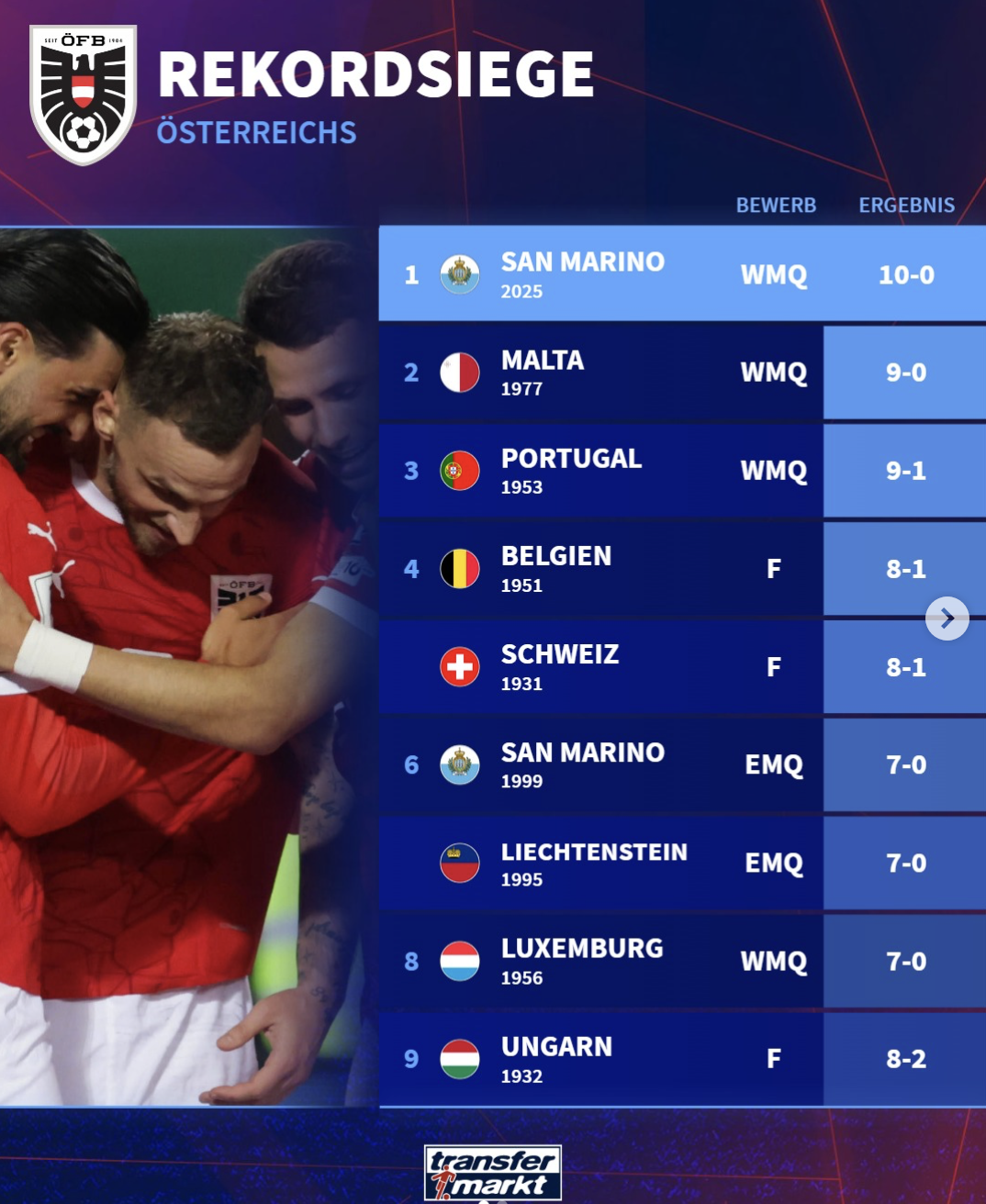 1.奥地利10-0圣马力诺(2025年世预赛)