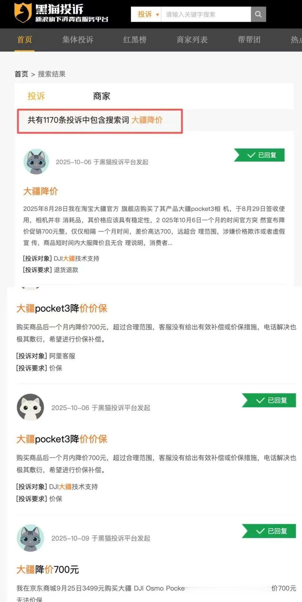 在黑猫投诉平台上搜索关键词“大疆降价”,目前已有1170条相关投诉