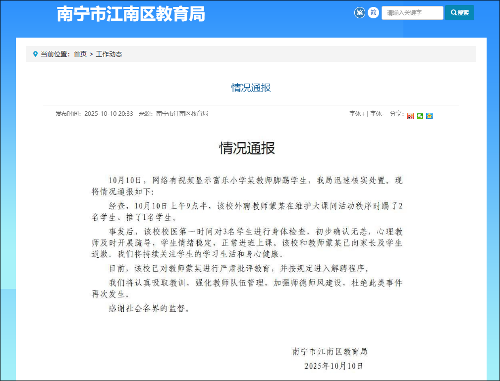 刚刚,广西南宁市江南区教育局发布情况通报: