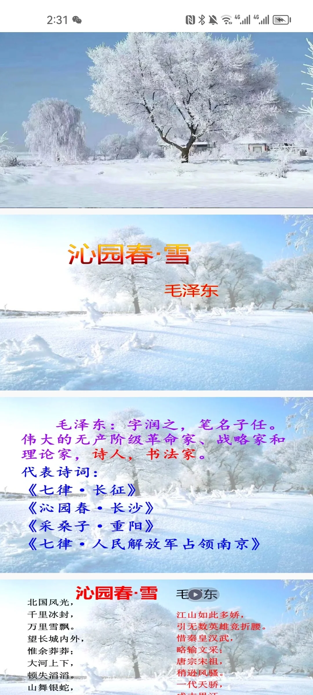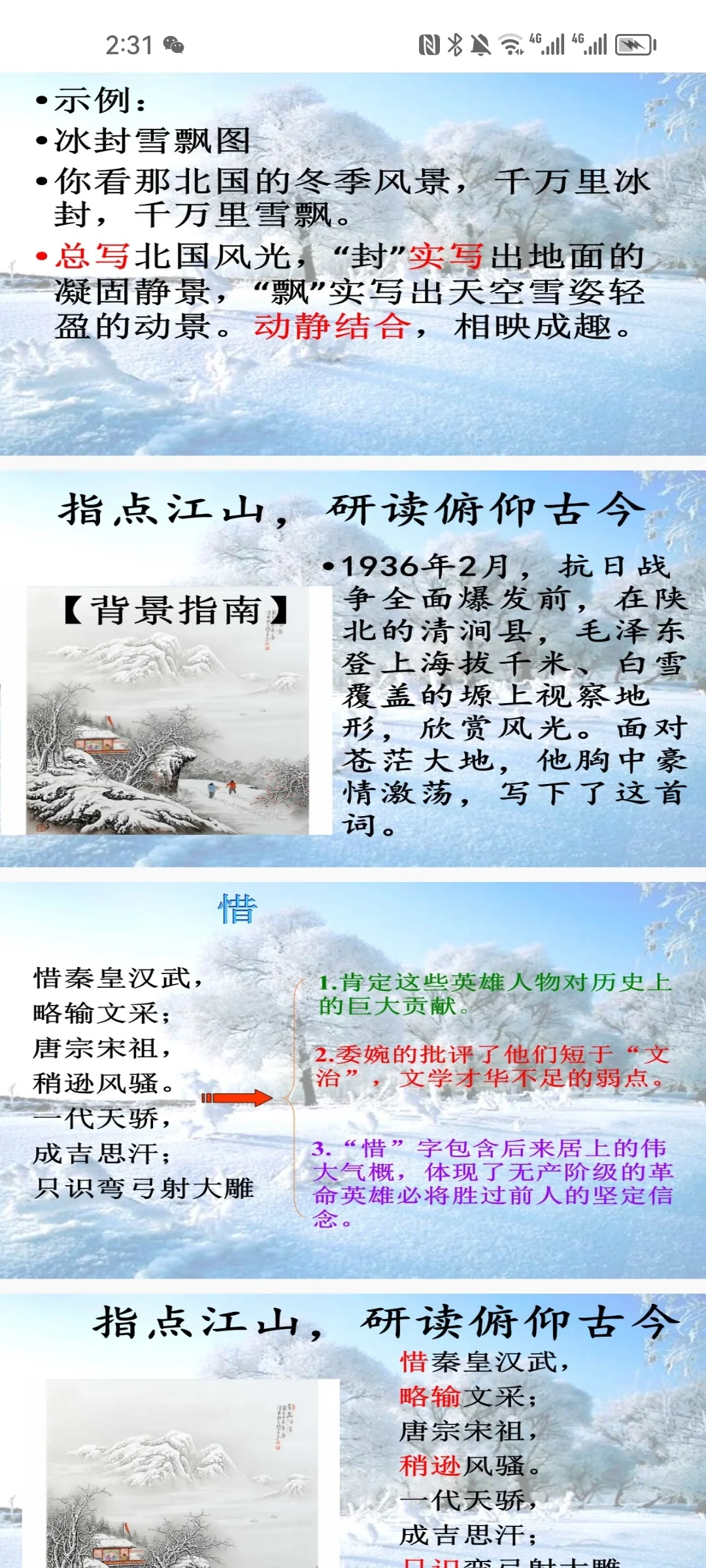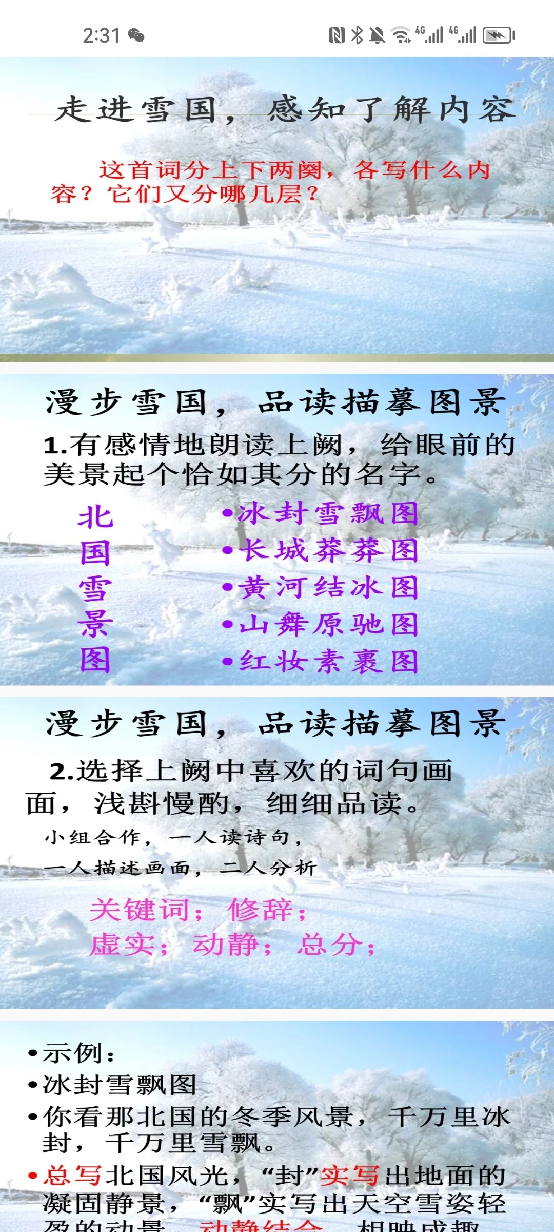 不得不说,执教王老师的教学设计充满了内涵“走进雪国感受美景”“漫步雪国,品读描摹图景”“指点江山,研读俯仰古今”“书生意气,竞读力争成诵”“挥斥方遒,悟读心有丘壑”,用文本的情境来教学,是最好的情境创设。