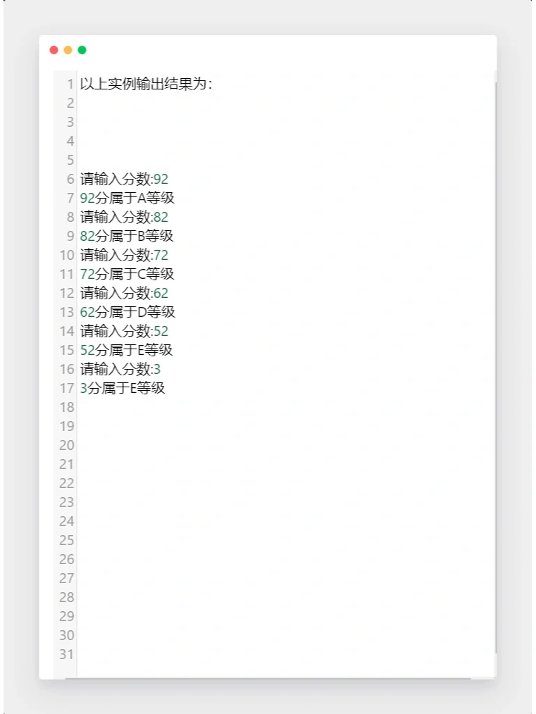 Python经典实例1⃣5⃣ ~ ⭐️题目: 利用条件运算符的嵌套来完成此题: 1⃣学习成绩在90-100分的同学用A表示 2⃣80-89分之间的用B表示 3⃣70-79分之间的用C表示 4⃣60-69分之间的用D表示 5⃣60分以下的用E表示 ~ 🌟程序分析: (a>b) ? a:b 这是条件运算符的基本例子 ~ ❗️❗️❗️用多分支条件语句就能解决这道题 ~ 🌟还可以增加一个功能: 判断输入分数小于零或者大于一百的时候应重新输入 ~