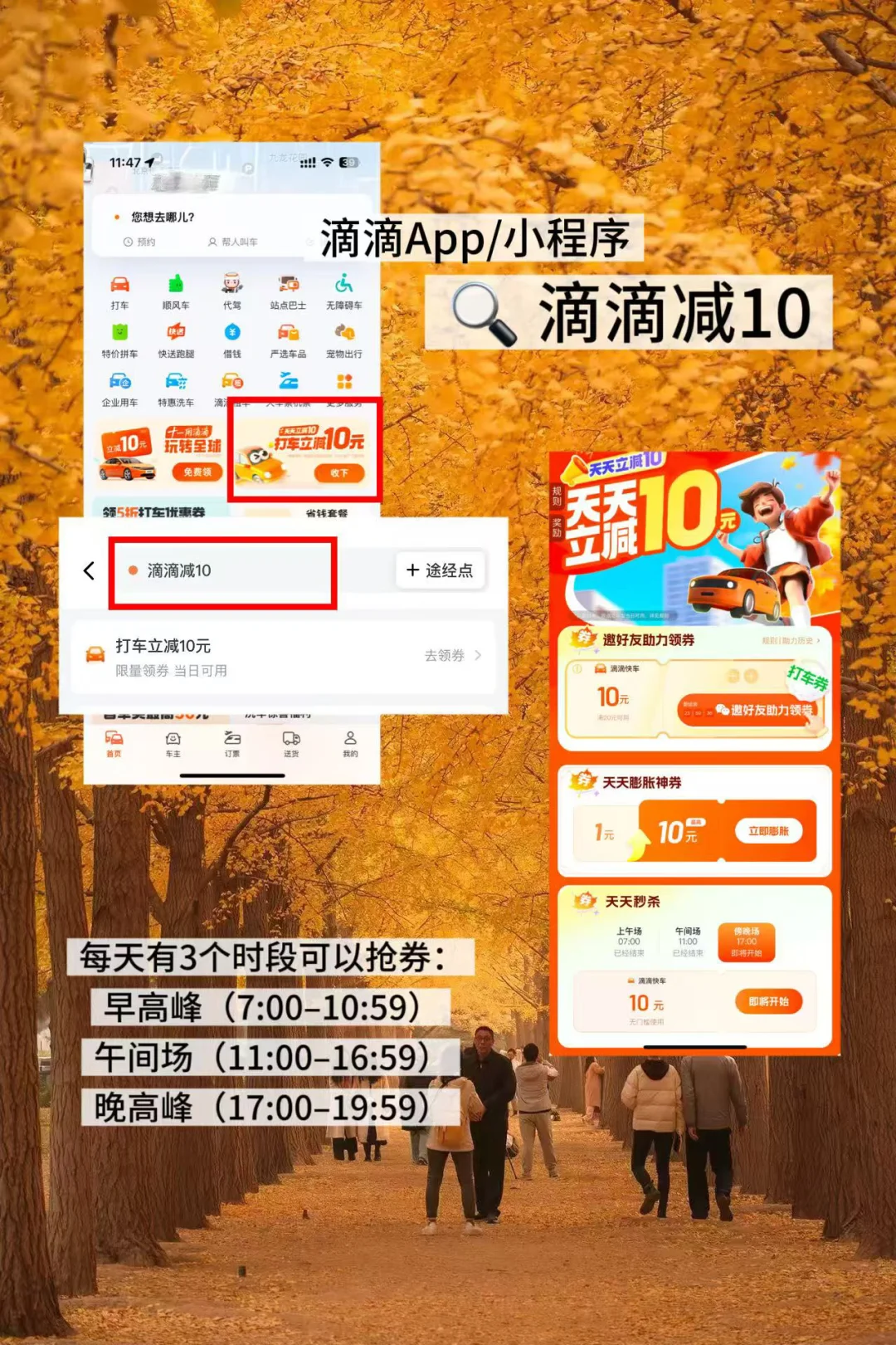 不过!!最近滴滴居然又放大招了!整个九月下旬到国庆假期,在北京天天打车都能立减10块!💰 每天三个时段准点抢券,手速快的话通勤、出门逛吃都能省一笔~