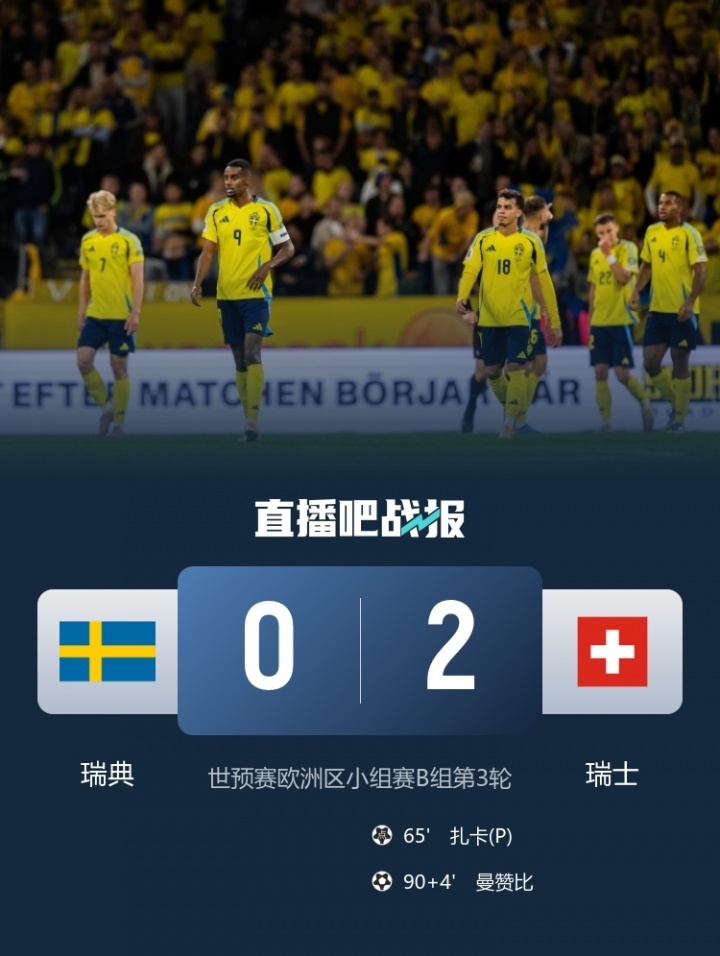 世预赛欧洲区小组赛B组第3轮,瑞典0-2不敌瑞士,遭遇三场不胜。
