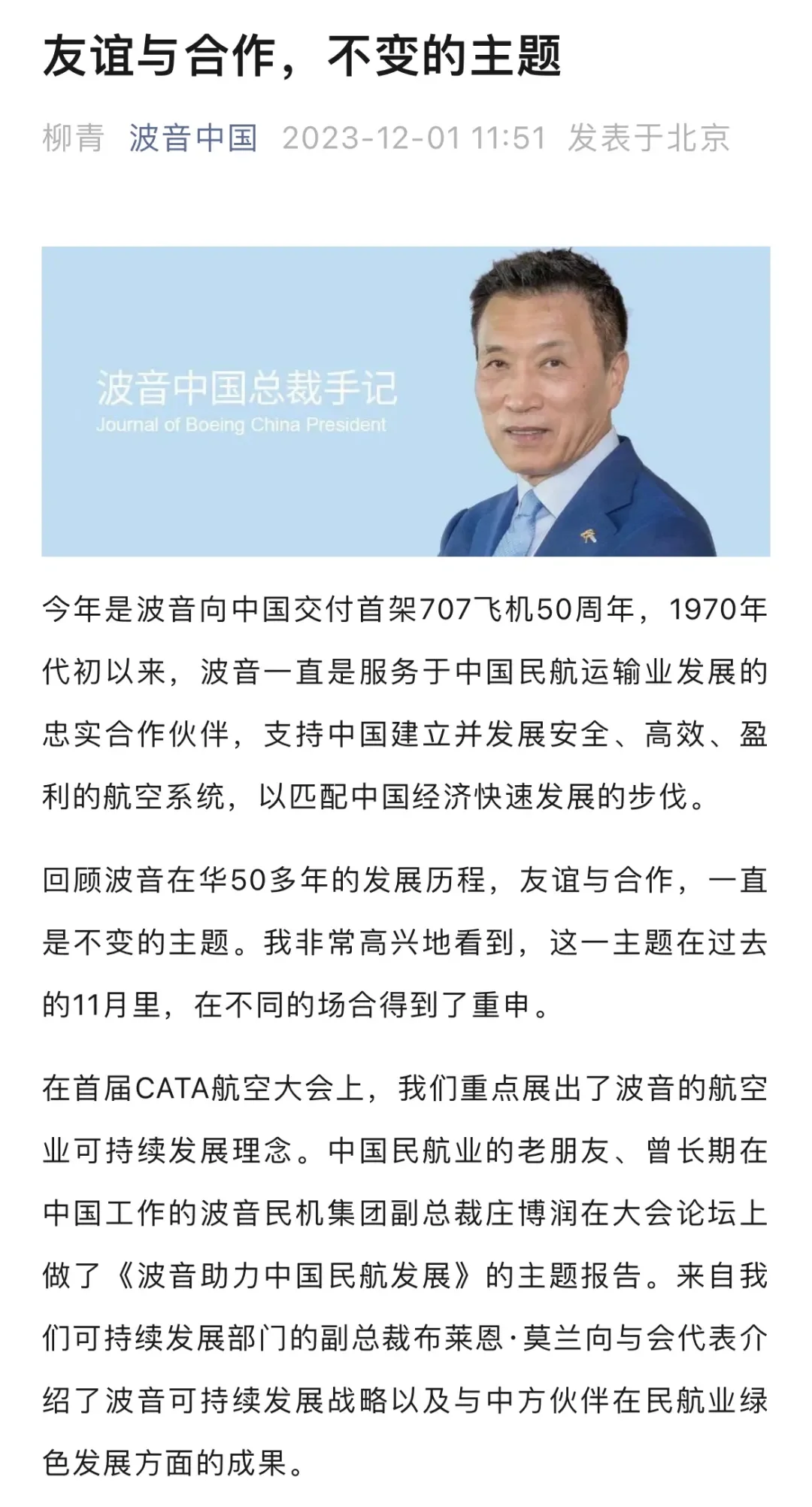 柳青在波音官方微信公众号发表了一篇名为《友谊与合作,不变的主题》的文章。