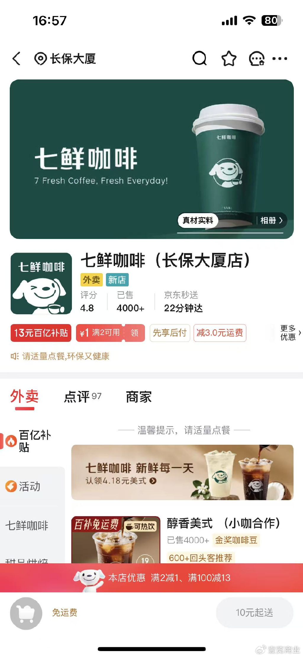目前,七鲜咖啡已上线京东秒送频道,在模式上主打外卖和自取。七鲜咖啡logo延续了七鲜小厨的绿色主色调,同时搭配着京东标志性的白狗Joy手捧咖啡的形象。
