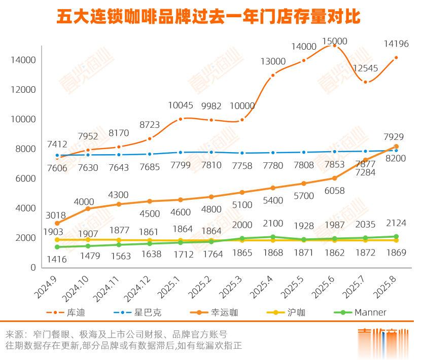 值得注意的是,据壹览商业数据,连锁咖啡行业门店门店分层明显,瑞幸、星巴克、库迪、幸运咖构成第一梯队,门店数量均超过7000家,马太效应持续加剧。其中,瑞幸咖啡以27814家门店断层领先,占总量的39.5%,规模壁垒稳固,并在高基数下保持稳健增长。库迪咖啡位居第二,门店数在1.5万家左右;幸运咖成功超越星巴克升至第三,印证其下沉策略的有效性。