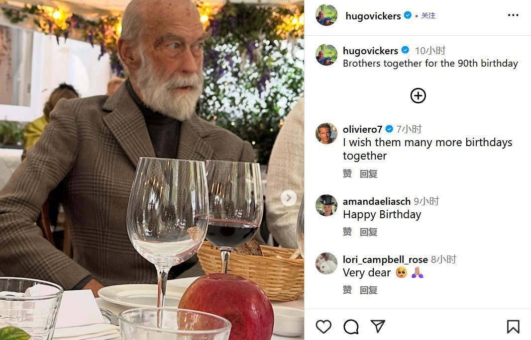 肯特公爵90大寿现场,王室隐藏兄弟情曝光,查尔斯威廉都坐不住了! 一张照片,揭开英国王室最温情的秘密! 今天,带大家直击一个连英国媒体都差点错过的大新闻——肯特公爵的90岁生日派对! 没错,就是那位女王伊丽莎白二世的堂弟、查尔斯国王的堂叔,英国王室最资深、最低调的公爵大人! 最近,王室传记作家雨果·维克斯在Instagram上悄悄分享了一张珍贵到极致的照片——肯特公爵和他弟弟迈克尔王子,这对平均年龄超过85岁的王室兄弟,竟然罕见同框了! 照片中,90岁的肯特公爵坐在摆满水果和蜡烛的生日蛋糕前,而77岁的迈克尔王子就坐在他身旁。 看那布置,显然是一个温馨的家庭聚会,没有盛大的排场,却充满了浓浓的亲情。 维克斯的配文简单却动人:“兄弟相聚,共庆90岁生日。” 要知道,这对兄弟虽然同是王室成员,但平时公开同框的机会并不多。 这次为了哥哥的90大寿,迈克尔王子特意赶来相聚,这份跨越半个多世纪的兄弟情,简直让人泪目! 肯特公爵的90大寿,可不是普通生日那么简单。 连查尔斯国王和威廉王子这两位王室顶流都亲自送上祝福! 查尔斯国王特别赞扬了堂叔“数十年来忠诚的公共服务和对王室的坚定奉献”。 这话可不是客套,肯特公爵可是实打实地为王室工作了超过60年! 从1952年就开始履行王室职责,他代表王室出席的官方活动数都数不过来。 直到90岁高龄,他依然是王室最受尊敬的成员之一,这份敬业精神,连年轻一辈都得竖起大拇指! 为什么这位90岁老人能赢得全王室尊重? 从青年到暮年,他见证了帝国的变迁、王室的起伏,却始终坚守在自己的岗位上。 即使到了90岁,他依然保持着优雅与尊严,成为王室最稳定的力量之一。 他的弟弟迈克尔王子虽然相对低调,但这次特意赶来为兄长庆生,也展现了王室成员间不常被外人看到的亲情一面。 顺便提一句,肯特公爵的90大寿再次证实了英国王室的强大长寿基因。 之前的女王伊丽莎白二世活到了96岁,女王母亲更是享年101岁。 看来肯特公爵这是要向着百岁老人冲刺啊! 这张简单的兄弟合影,胜过千言万语。 它讲述的不仅是一位老人的生日,更是关于忠诚、家庭与传承的动人故事。 让我们一同祝福这位为英国王室奉献一生的老人:生日快乐,健康长寿! 本文由【全球奇趣娱乐八卦】原创,想看更多王室独家解析,记得关注点赞哦!
