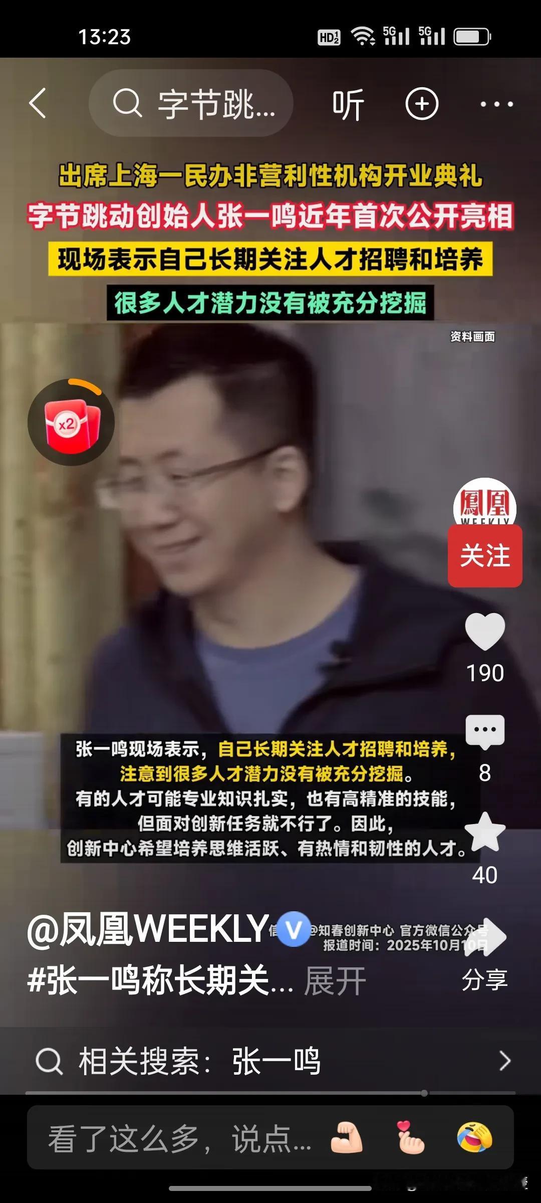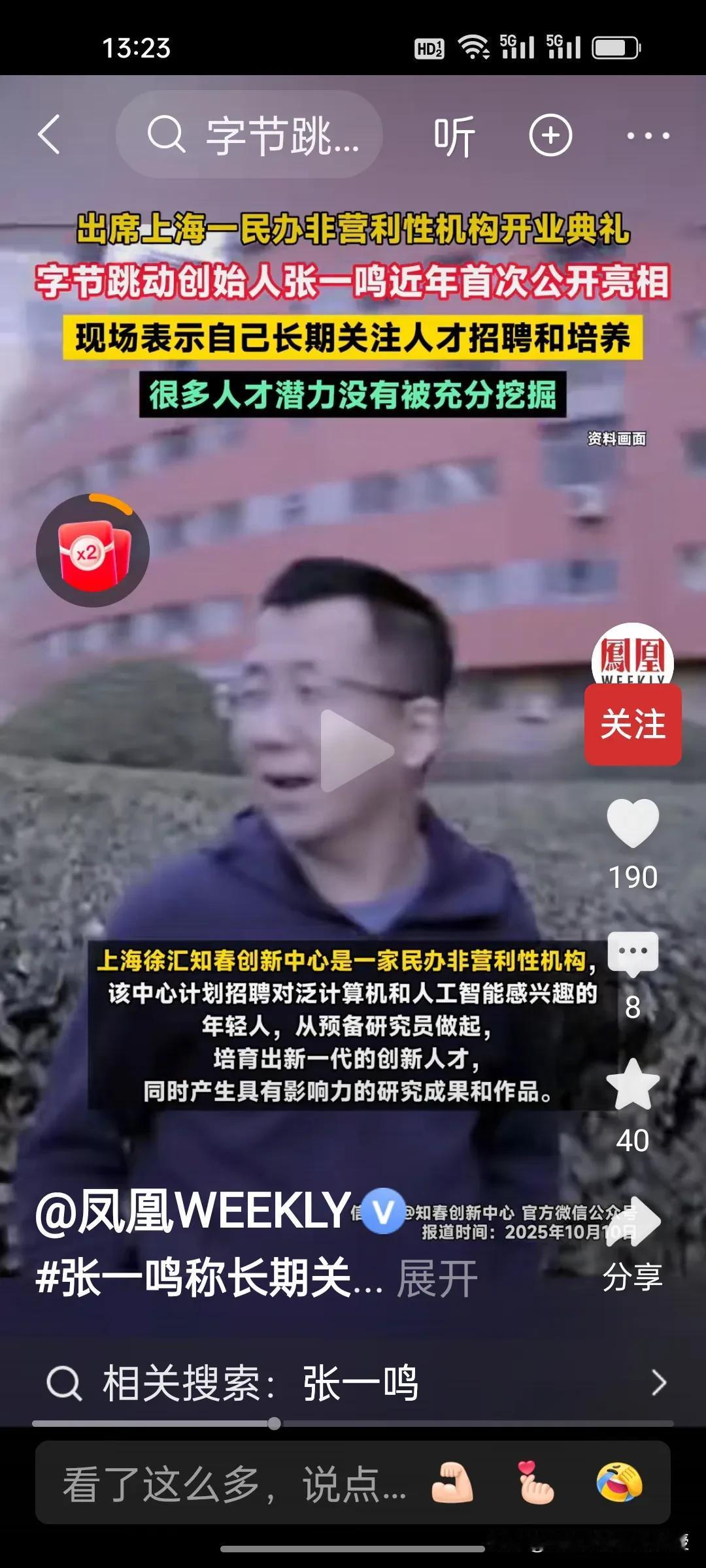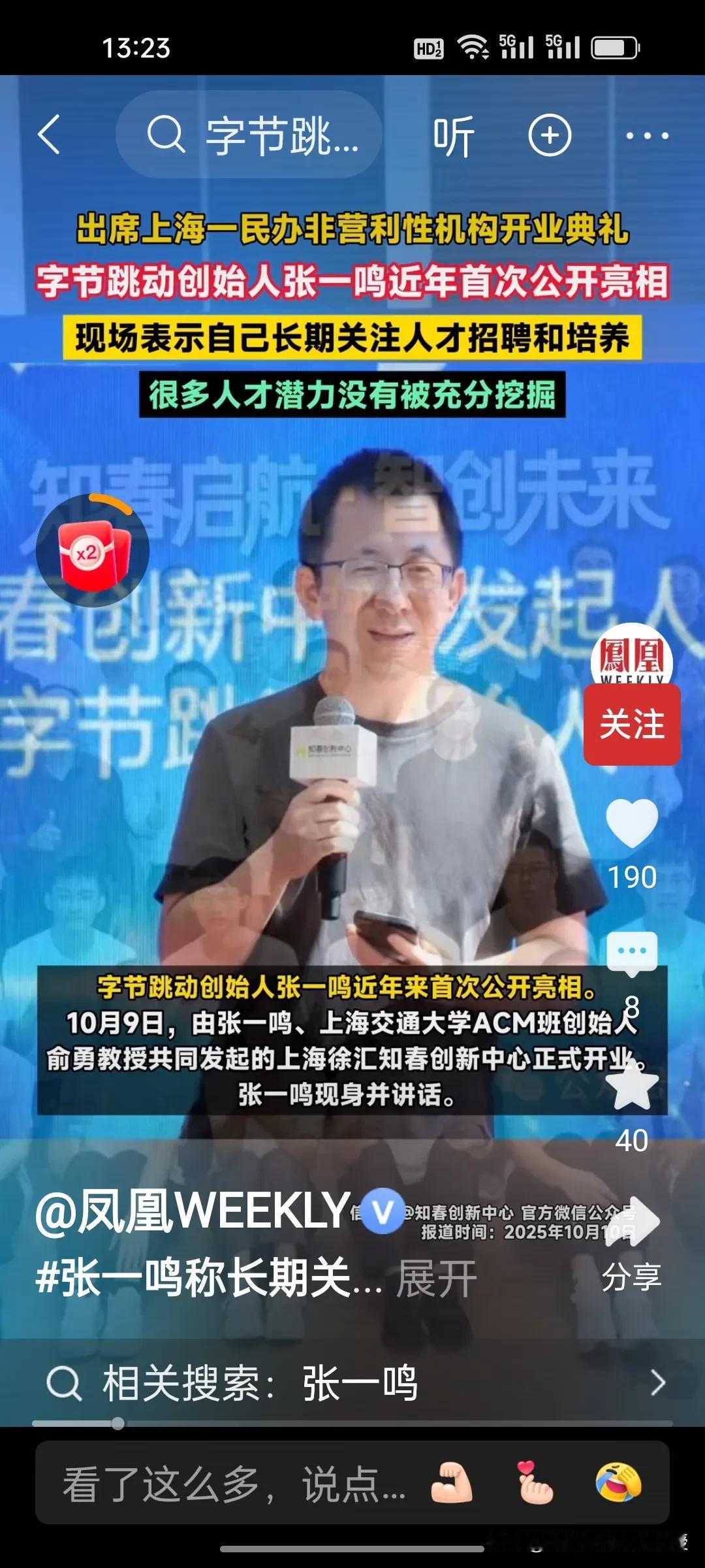 张一鸣近期罕见现身上海,出席自己创建的创新中心开业典礼。 张一鸣的性格内敛,一向很少参与公开活动,但是昨天他却现身上海,黑T恤黑裤子,非常低调地出席和上海交大一位教授共同发起的上海徐汇知春创新中心,这是非营利性机构,主要招聘和培养一些对泛计算机和人工智能感兴趣的创新人才,同时能产生具有影响力的作品和科研成果。 张一鸣这个做法跟曹德旺办大学有异曲同工之妙,但是他选择跟高校直接合作,集中力量花小钱办大事,一个公司经久不衰靠的就是人才,短时间招聘还不一定有合适的人才,不如长期培养有潜力的年轻人,这个创新中心可以看作是人才储备库,是公司迈向新台阶的后备军。