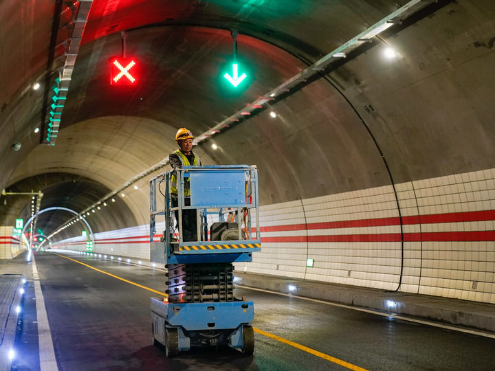 2025年9月28日,中铁十一局的工人在四川夹金山隧道内进行收尾巡查施工。新华社记者王曦摄